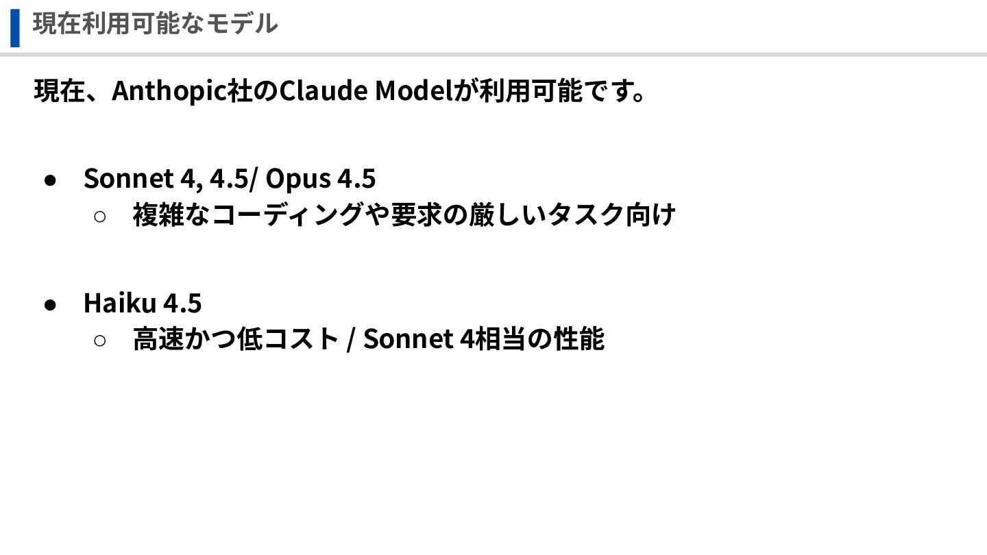 現在利⽤可能なモデル 現在、Anthopic社のClaude Modelが利⽤可能です。 • Sonnet 4, 4.5/ Opus 4.5 ◦