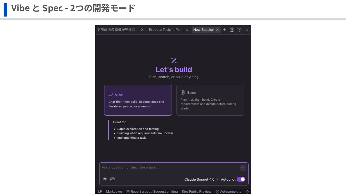 従来の⽣成AIを持ちいた開発の課題 - 仕様駆動開発とは - Spec/Vibeモード - Hooks, Steering - 要件定義からアプリ開発