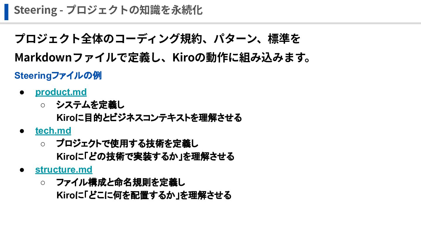 Steering - プロジェクトの知識を永続化 プロジェクト全体のコーディング規約、パターン、標準を Markdownファイルで定義し、Kiroの動作に組み込みます。 Steeringファイルの例 • product.md ◦ システムを定義し