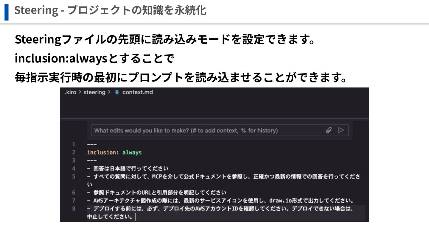 Steering - プロジェクトの知識を永続化 Steeringファイルの先頭に読み込みモードを設定できます。 inclusion:alwaysとすることで 毎指⽰実⾏時の最初にプロンプトを読み込ませることができます。