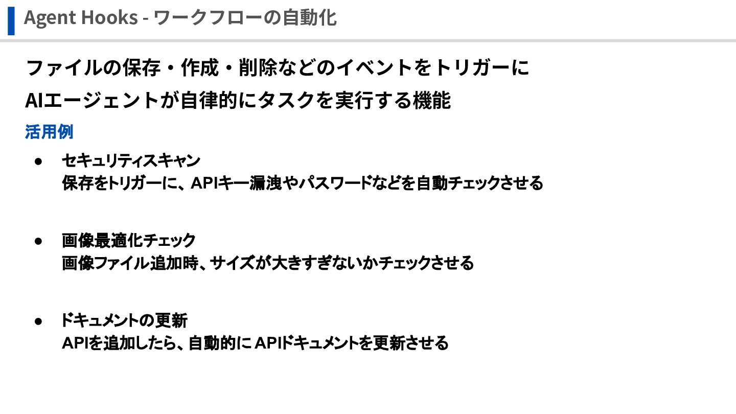 Agent Hooks - ワークフローの⾃動化 ファイルの保存‧作成‧削除などのイベントをトリガーに AIエージェントが⾃律的にタスクを実⾏する機能 活用例 • セキュリティスキャン 保存をトリガーに、
