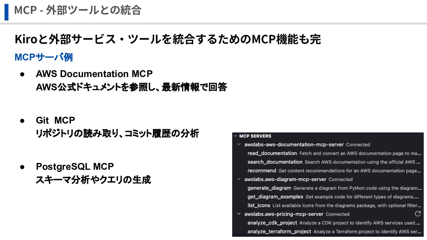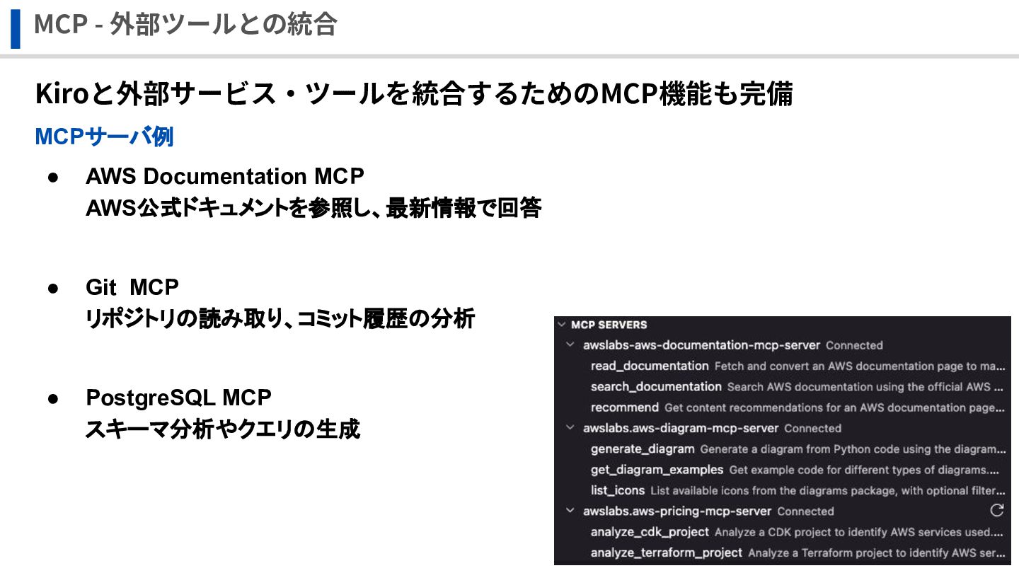 MCP - 外部ツールとの統合 Kiroと外部サービス‧ツールを統合するためのMCP機能も完備 MCPサーバ例 • AWS Documentation MCP AWS公式ドキュメントを参照し、最新情報で回答