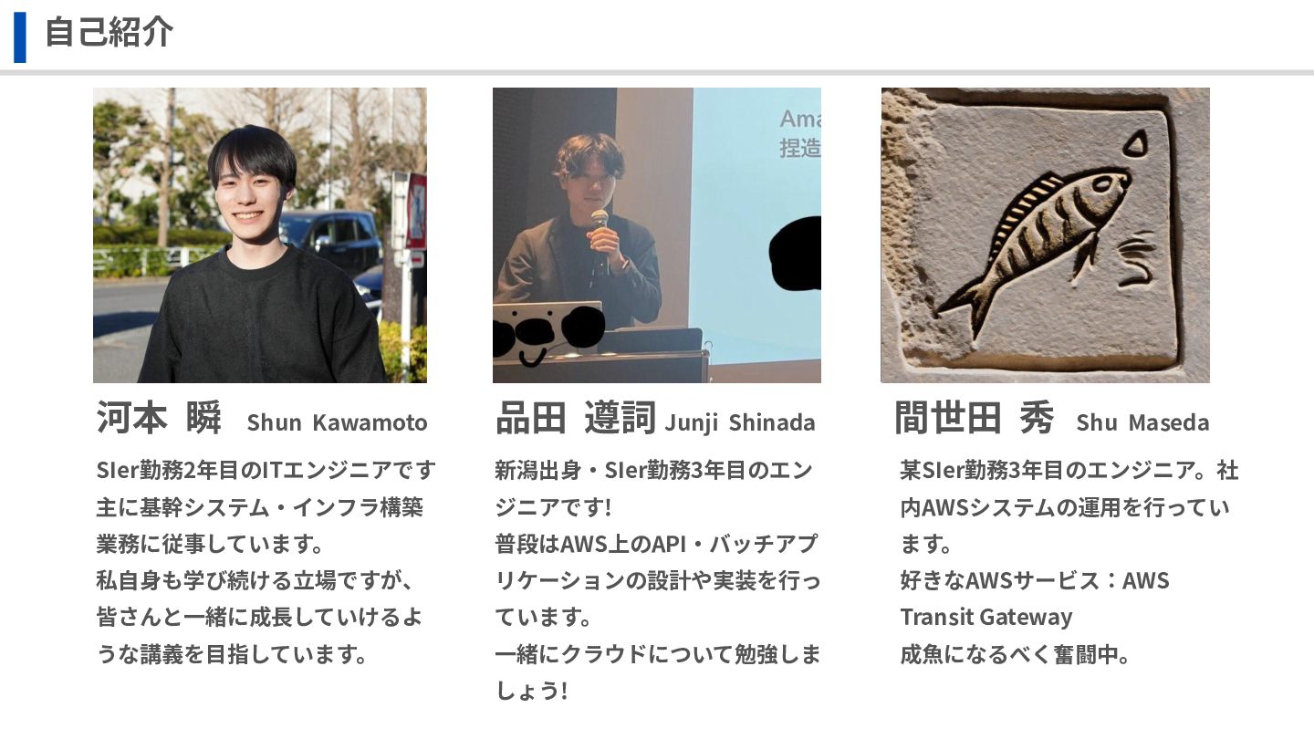 品⽥ 遵詞 間世⽥ 秀 SIer勤務2年⽬のITエンジニアです 主に基幹システム‧インフラ構築 業務に従事しています。 私⾃⾝も学び続ける⽴場ですが、 皆さんと⼀緒に成⻑していけるよ うな講義を⽬指しています。 Shun Kawamoto Junji Shinada Shu Maseda 某SIer勤務3年⽬のエンジニア。社 内AWSシステムの運⽤を⾏ってい ます。 好きなAWSサービス:AWS Transit Gateway 成⿂になるべく奮闘中。