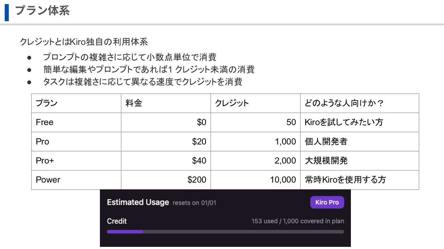 $20 1,000 個人開発者 Pro+ $40 2,000 大規模開発 Power $200 10,000 常時Kiroを使用する方 クレジットとはKiro独自の利用体系 • プロンプトの複雑さに応じて小数点単位で消費 • 簡単な編集やプロンプトであれば 1 クレジット未満の消費 • タスクは複雑さに応じて異なる速度でクレジットを消費