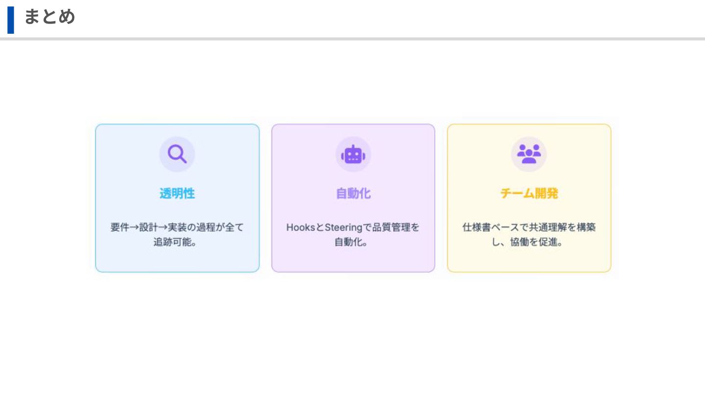 Kiroに目的とビジネスコンテキストを理解させる • tech.md ◦ プロジェクトで使用する技術を定義し Kiroに「どの技術で実装するか」を理解させる • structure.md ◦ ファイル構成と命名規則を定義し Kiroに「どこに何を配置するか」を理解させる