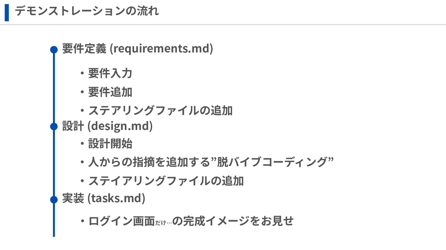 デモンストレーションの流れ 要件定義 (requirements.md) 設計 (design.md) 実装 (tasks.md) ‧要件⼊⼒ ‧要件追加 ‧ステアリングファイルの追加