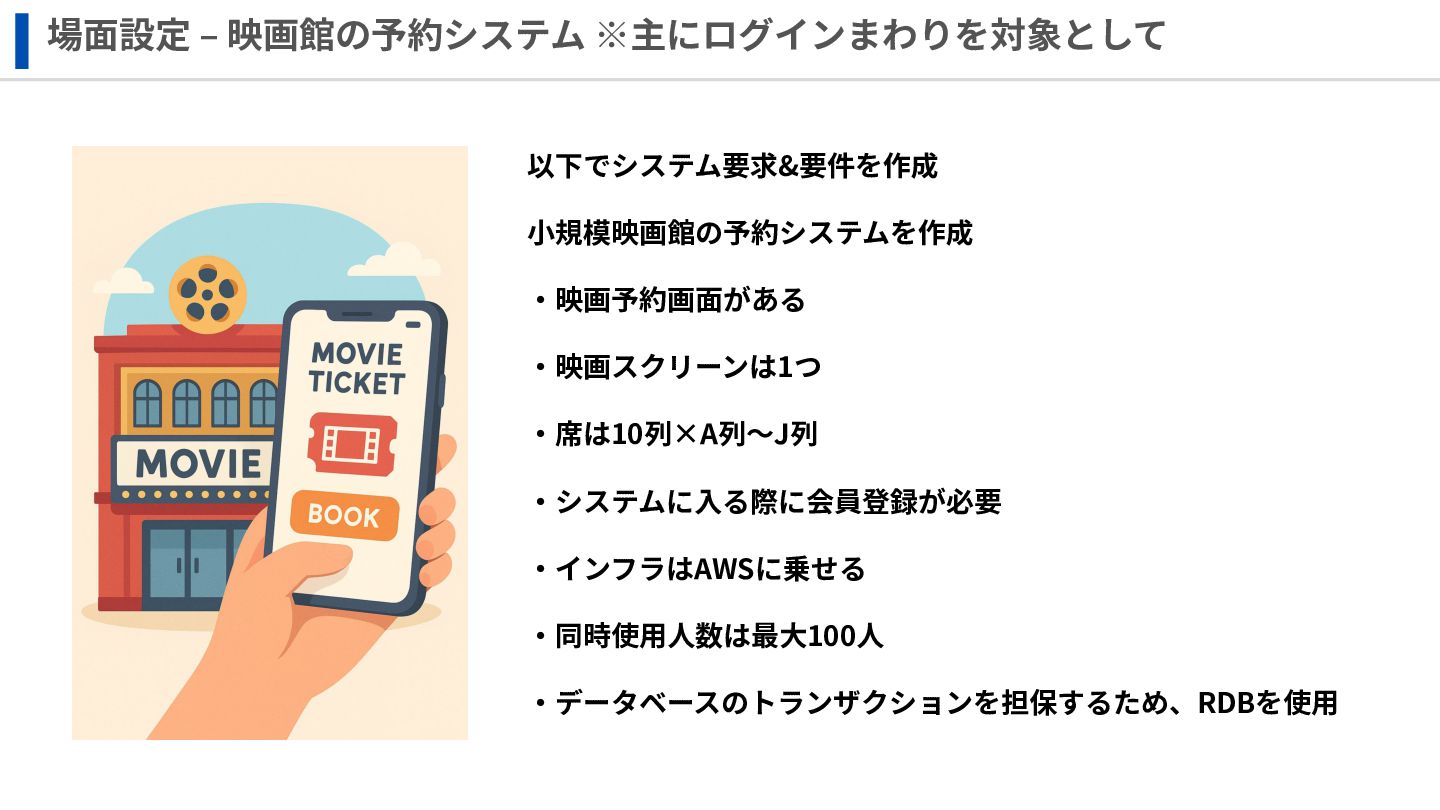 場⾯設定 ‒ 映画館の予約システム ※主にログインまわりを対象として 以下でシステム要求&要件を作成 ⼩規模映画館の予約システムを作成 ‧映画予約画⾯がある ‧映画スクリーンは1つ ‧席は10列×A列〜J列 ‧システムに⼊る際に会員登録が必要