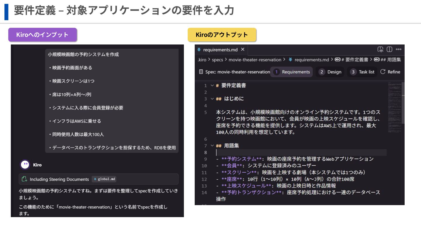 要件定義 ‒ 対象アプリケーションの要件を⼊⼒ Kiroへのインプット Kiroのアウトプット