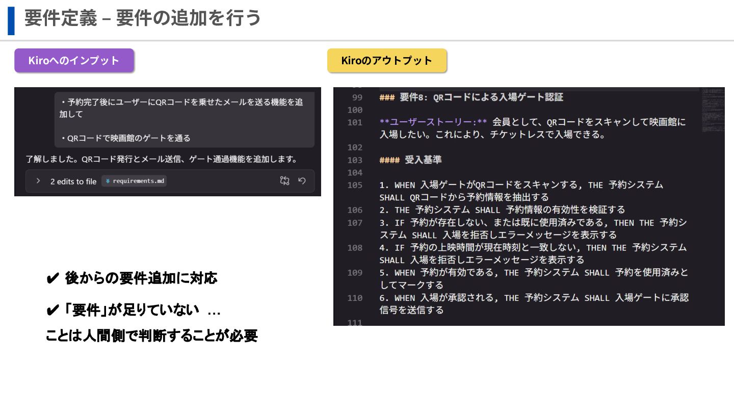 要件定義 ‒ 要件の追加を⾏う Kiroへのインプット Kiroのアウトプット ✔ 後からの要件追加に対応 ✔ 「要件」が足りていない …