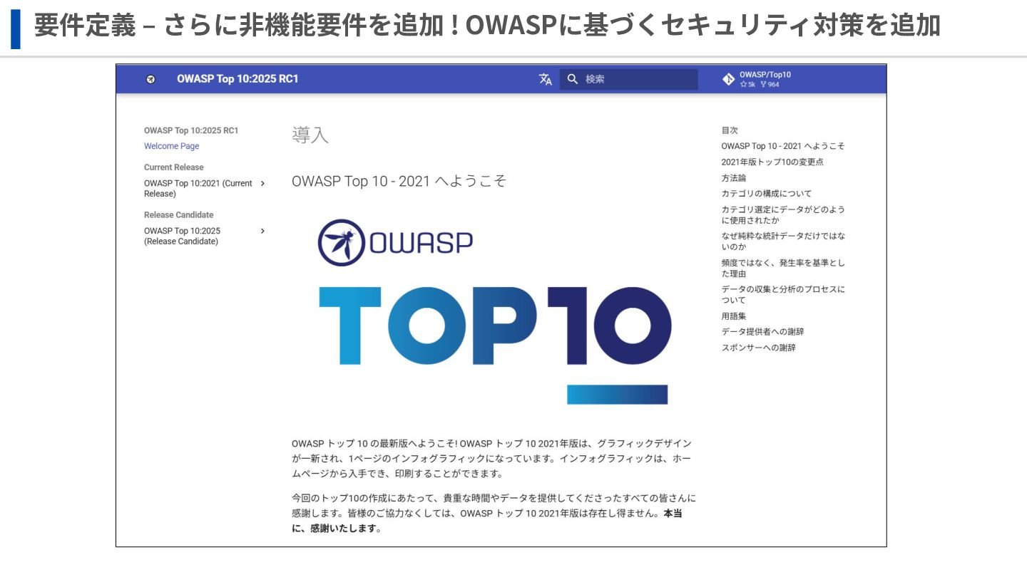 要件定義 ‒ さらに⾮機能要件を追加 ! OWASPに基づくセキュリティ対策を追加