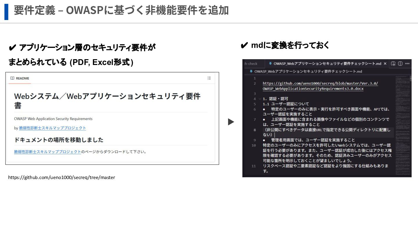 要件定義 ‒ OWASPに基づく⾮機能要件を追加 https://github.com/ueno1000/secreq/tree/master ✔ アプリケーション層のセキュリティ要件が まとめられている (PDF, Excel形式) ✔