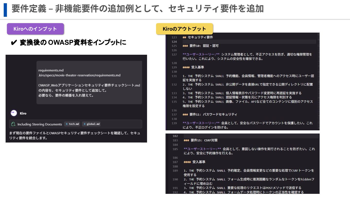 要件定義 ‒ ⾮機能要件の追加例として、セキュリティ要件を追加 Kiroへのインプット Kiroのアウトプット ✔ 変換後の OWASP資料をインプットに
