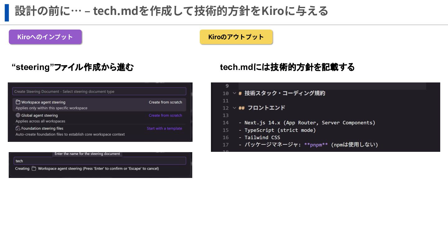 設計の前に… ‒ tech.mdを作成して技術的⽅針をKiroに与える Kiroへのインプット Kiroのアウトプット “steering”ファイル作成から進む tech.mdには技術的方針を記載する