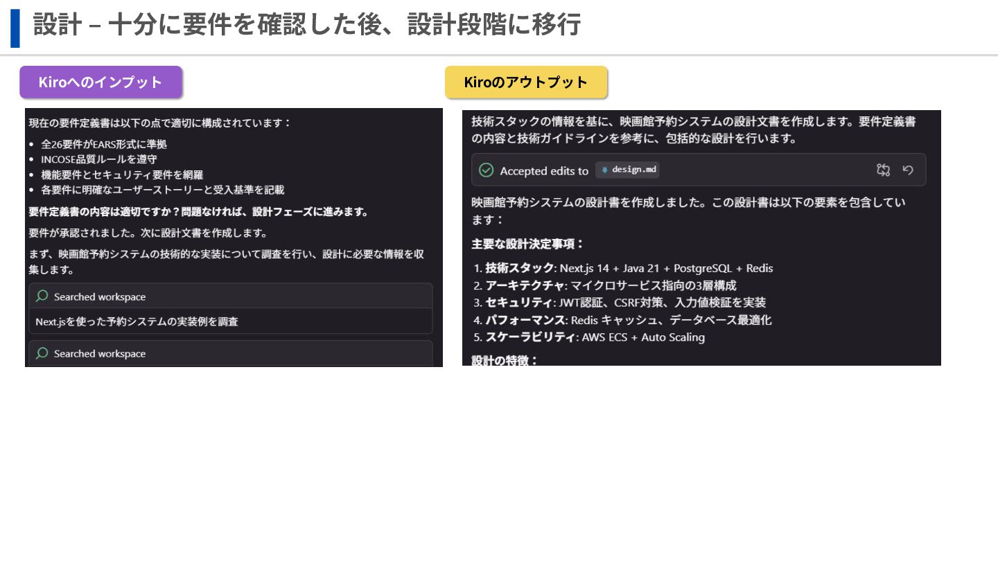 設計 ‒ ⼗分に要件を確認した後、設計段階に移⾏ Kiroへのインプット Kiroのアウトプット
