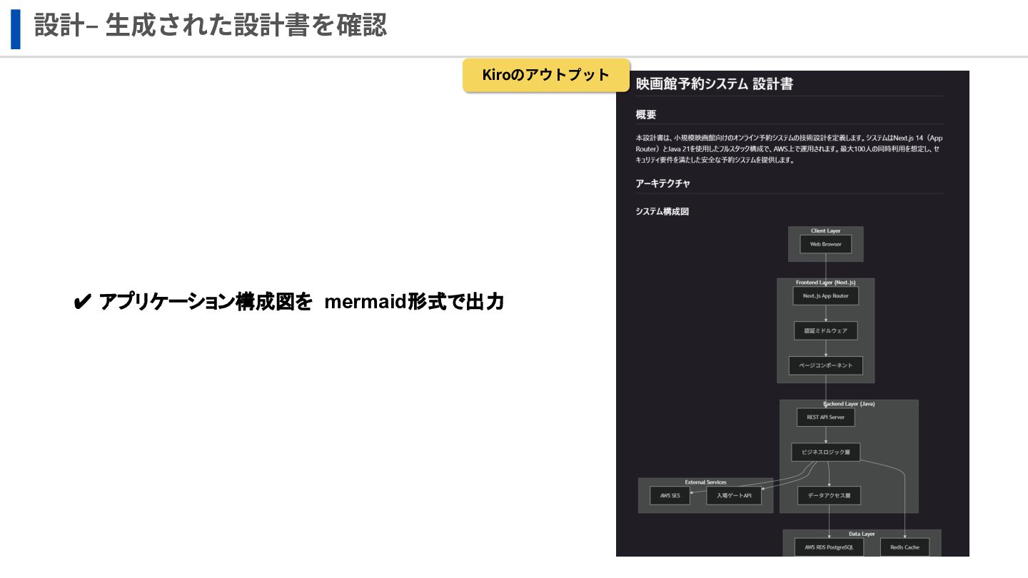 設計‒ ⽣成された設計書を確認 Kiroのアウトプット ✔ アプリケーション構成図を mermaid形式で出力