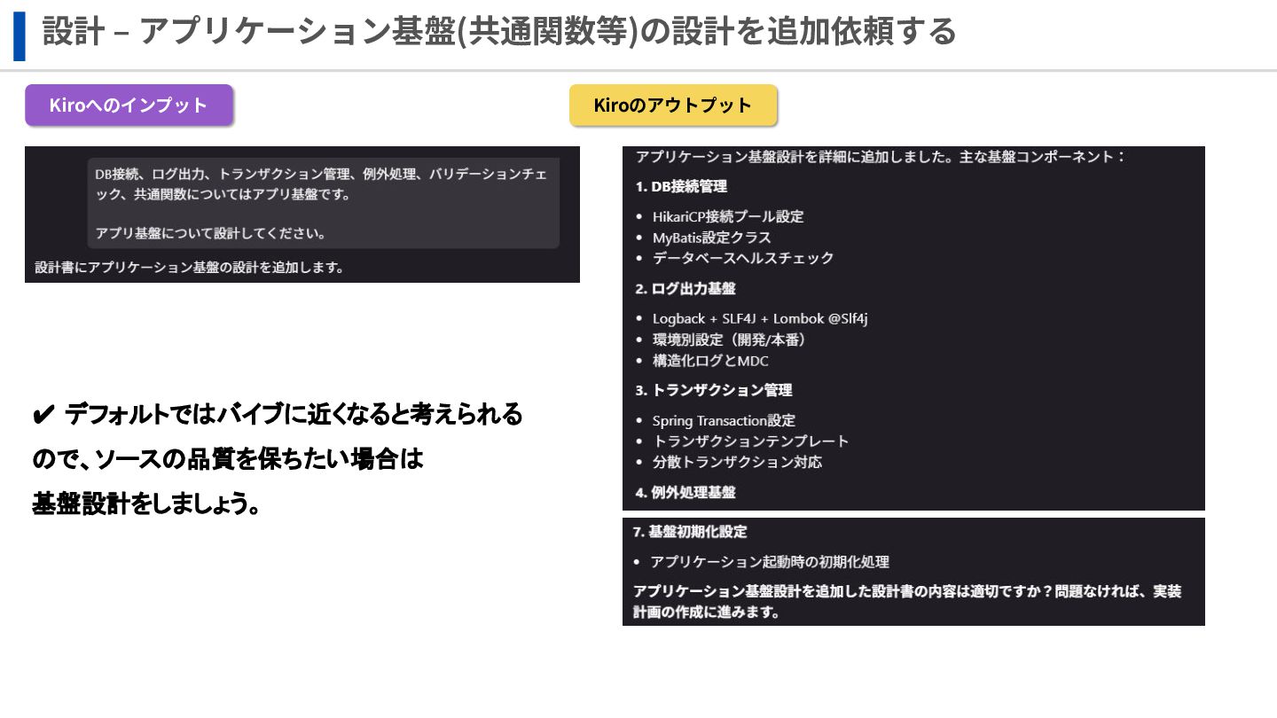 設計 ‒ アプリケーション基盤(共通関数等)の設計を追加依頼する Kiroへのインプット Kiroのアウトプット ✔ デフォルトではバイブに近くなると考えられる ので、ソースの品質を保ちたい場合は 基盤設計をしましょう。