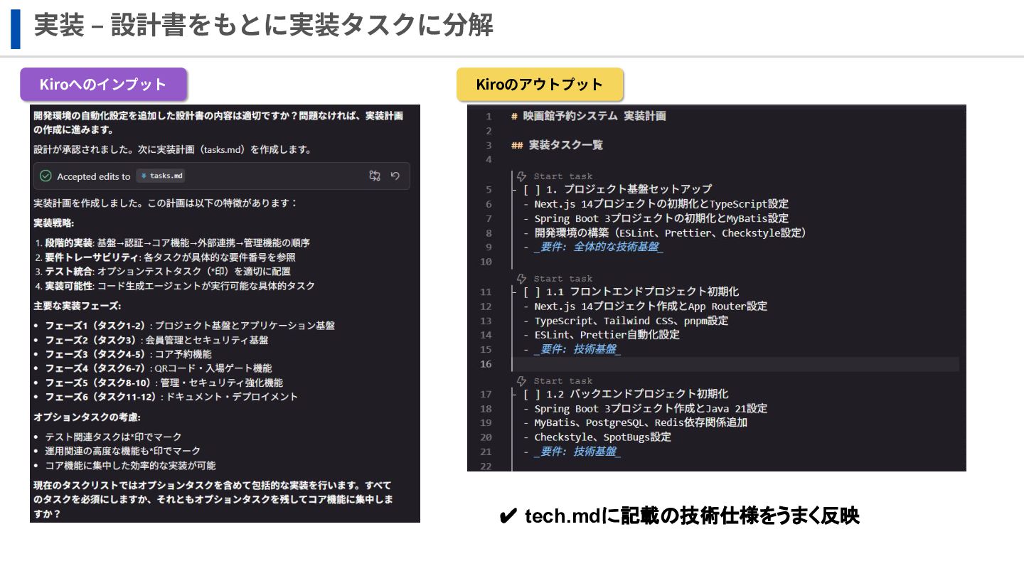 実装 ‒ 設計書をもとに実装タスクに分解 Kiroへのインプット Kiroのアウトプット ✔ tech.mdに記載の技術仕様をうまく反映