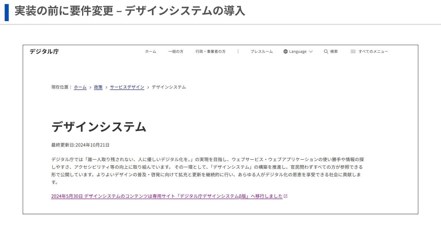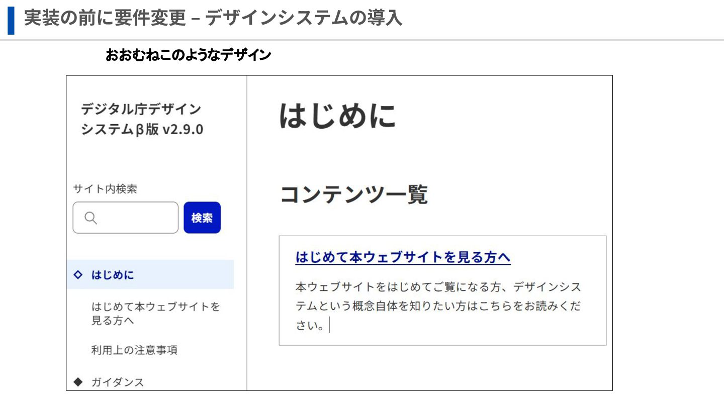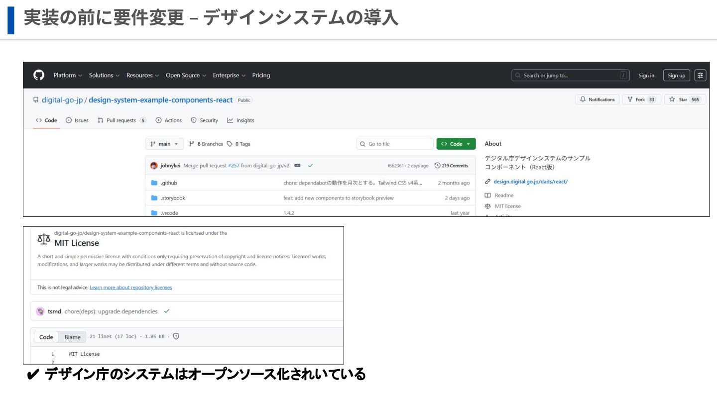実装の前に要件変更 ‒ デザインシステムの導⼊ ✔ デザイン庁のシステムはオープンソース化されいている