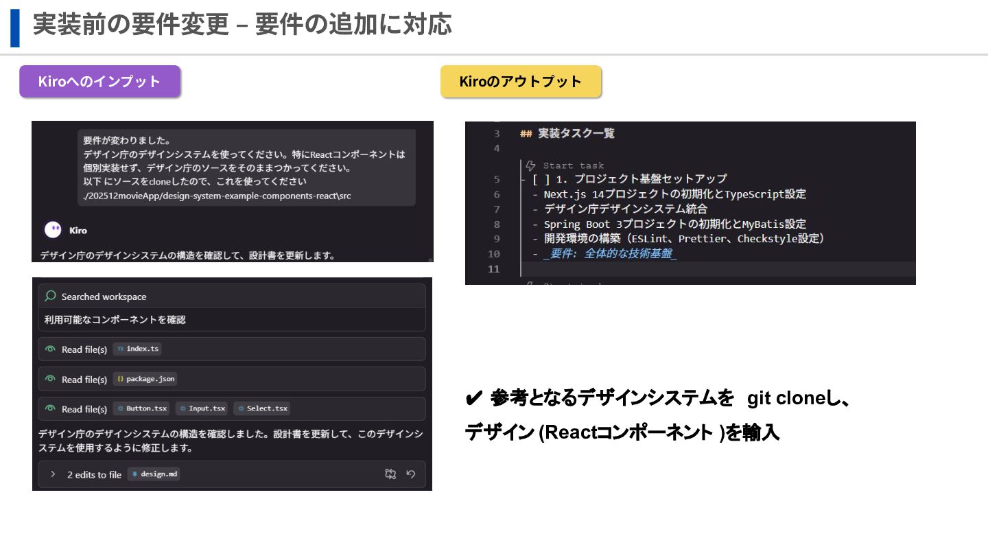 実装前の要件変更 ‒ 要件の追加に対応 Kiroへのインプット Kiroのアウトプット ✔ 参考となるデザインシステムを git cloneし、 デザイン