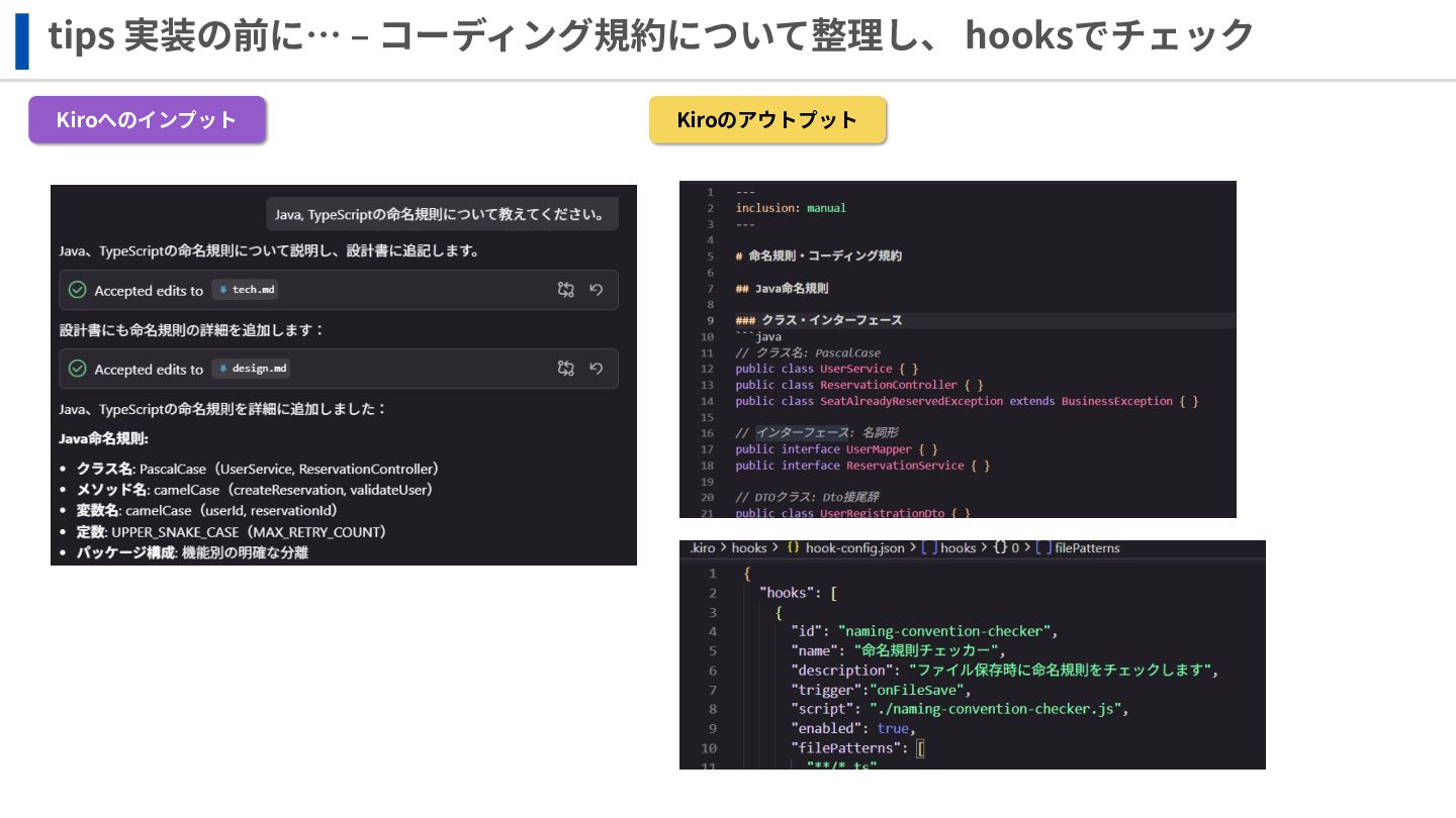 tips 実装の前に… ‒ コーディング規約について整理し、 hooksでチェック Kiroへのインプット Kiroのアウトプット