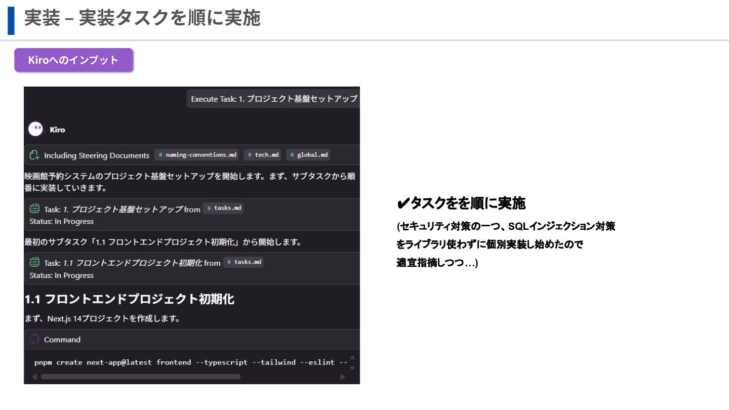 実装 ‒ 実装タスクを順に実施 Kiroへのインプット ✔タスクをを順に実施 (セキュリティ対策の一つ、SQLインジェクション対策 をライブラリ使わずに個別実装し始めたので 適宜指摘しつつ…)