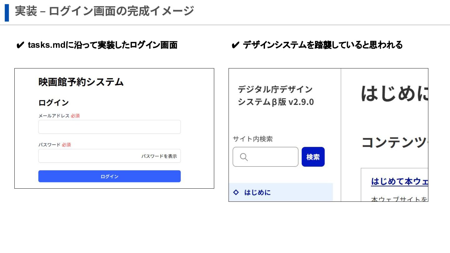 実装 ‒ ログイン画⾯の完成イメージ ✔ tasks.mdに沿って実装したログイン画面 ✔ デザインシステムを踏襲していると思われる