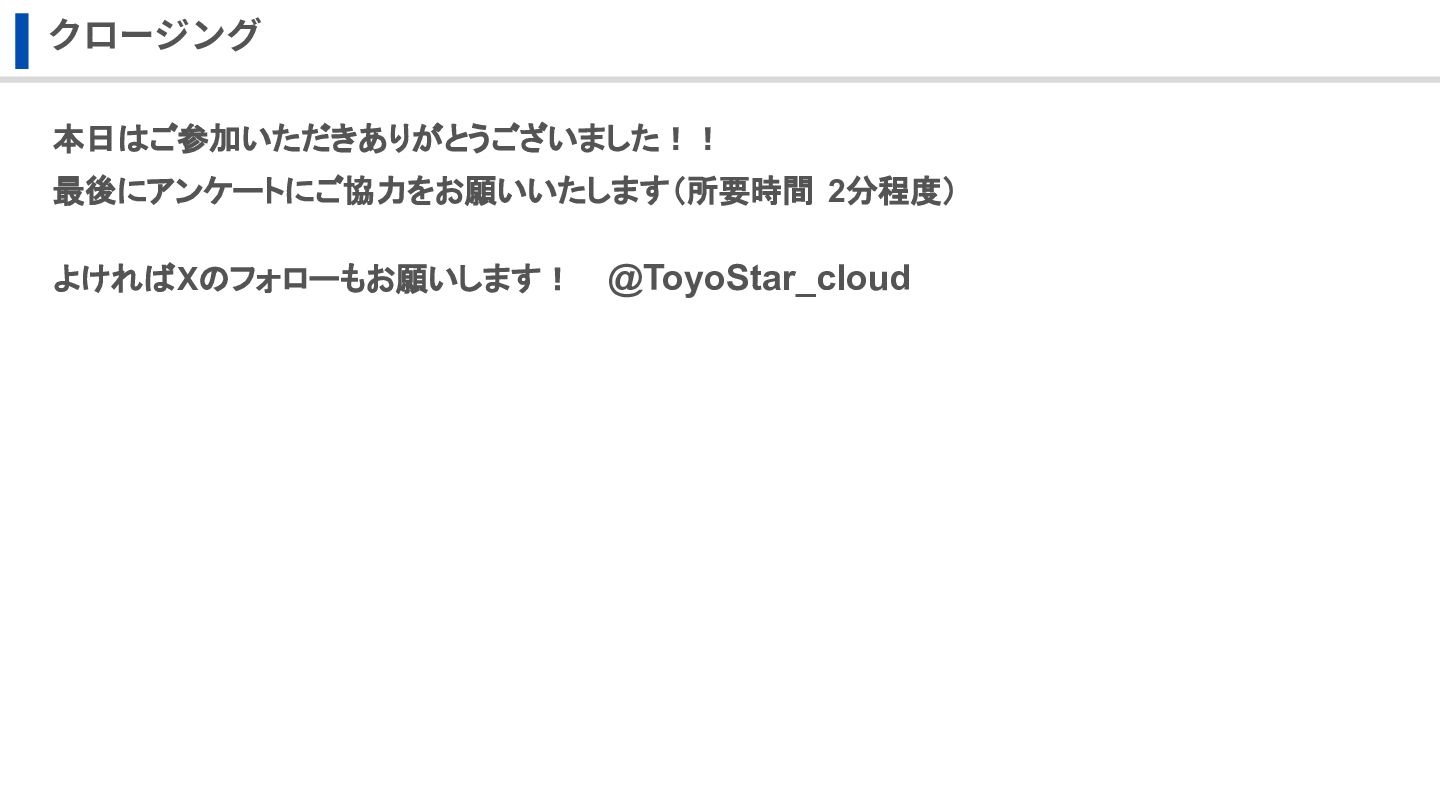 クロージング 最後にアンケートにご協力をお願いいたします(所要時間 2分程度) 本日はご参加いただきありがとうございました!! よければXのフォローもお願いします! @ToyoStar_cloud