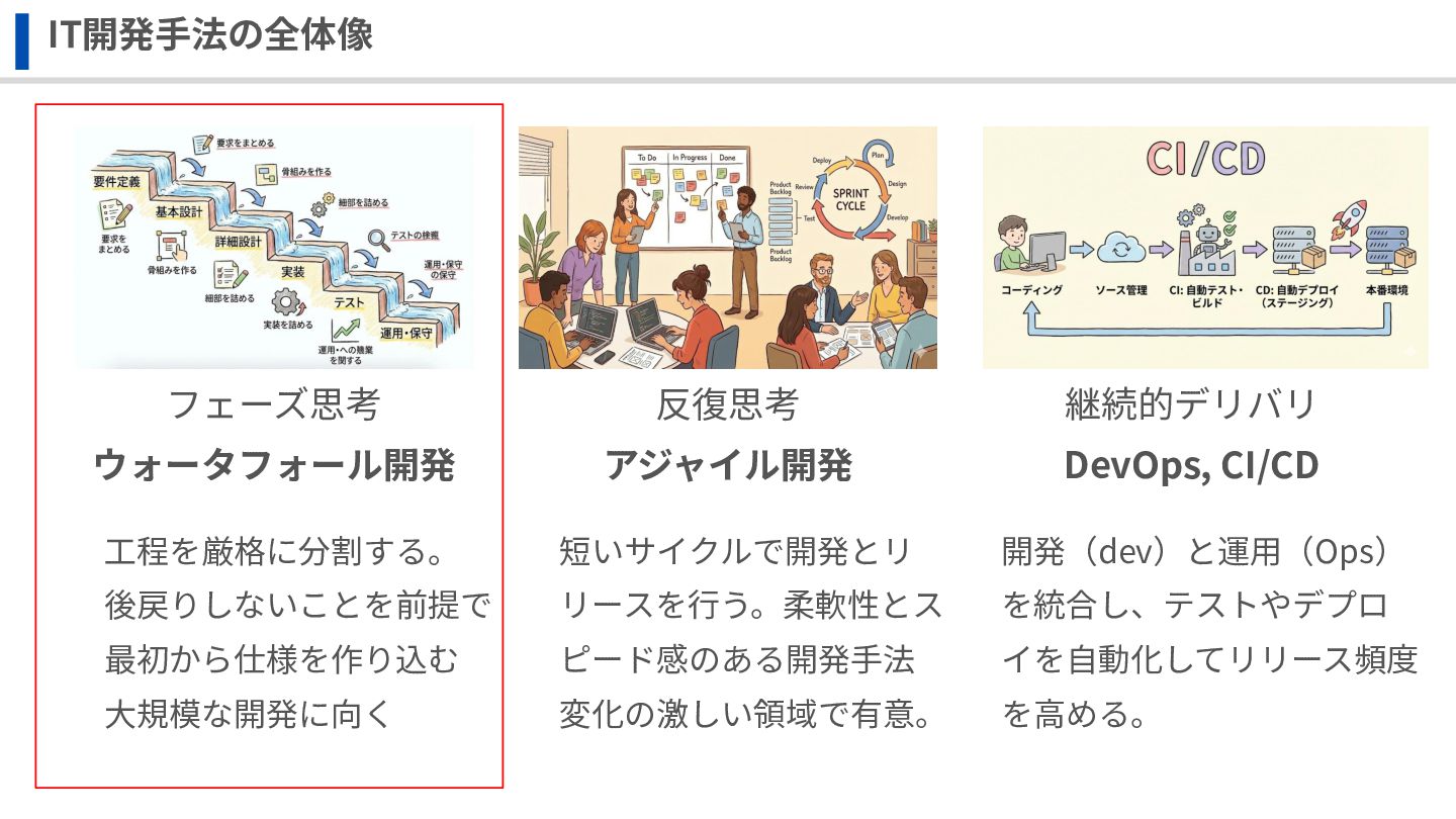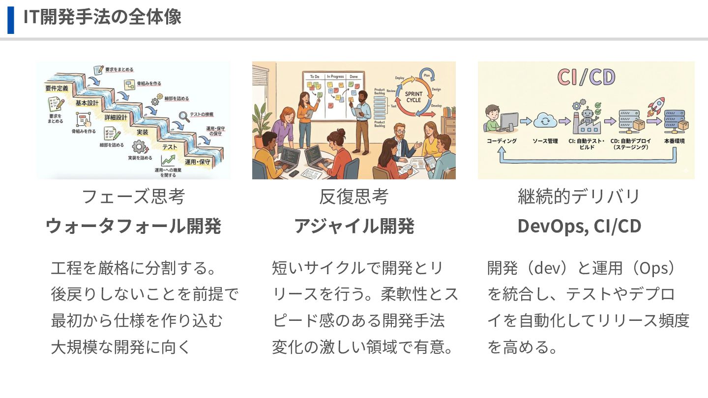 IT開発⼿法の全体像 反復思考 アジャイル開発 フェーズ思考 ウォータフォール開発 継続的デリバリ DevOps, CI/CD ⼯程を厳格に分割する。 後戻りしないことを前提で