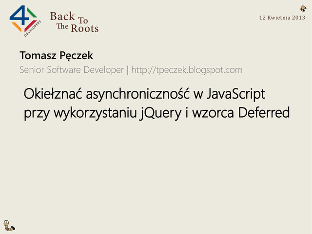 Pomimo tego, że jQuery.Deferred zostało wprowadzone już jakiś czas temu jego zastosowanie wciąż rzadko wykracza poza najbardziej podstawowe scenariusze. W tej prezentacji przedstawię bliżej zarówno ogólny koncept wzorca „Deferred” jak i jego implementację w ramach biblioteki jQuery w celu zapoznania się z możliwościami zarządzania, synchronizowania i transformacji wyników asynchronicznego kodu. Oczywiście nie zabraknie przykładów.