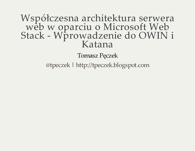 W ramach tej sesji przedstawione zostaną szczegóły specyfikacji OWIN, jej rozszerzenie a także pojęcia i zasady przyjęte przez społeczność. Następnie omówiony zostanie projekt Katana, a w szczególności udostępniane w jego ramach opcje hostowania aplikacji oraz moduły. Oczywiście nie zabraknie przykładów.