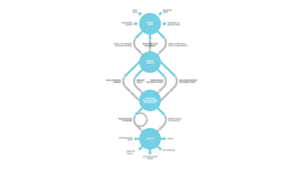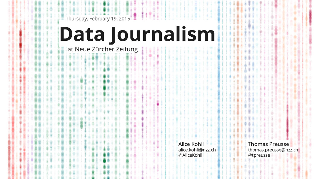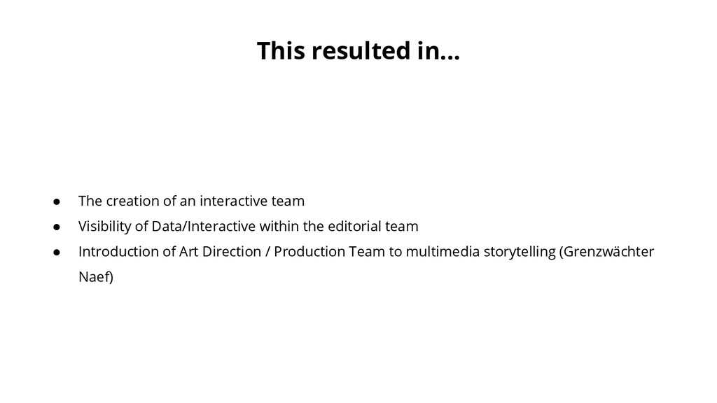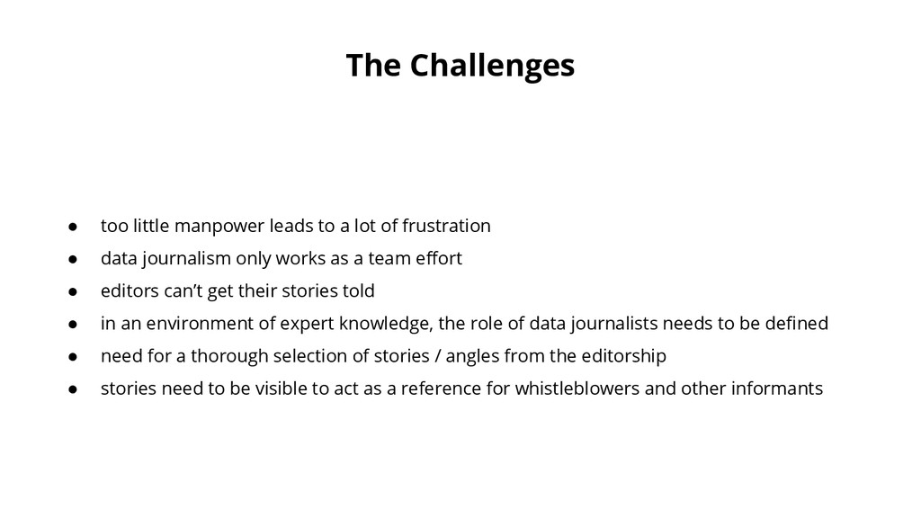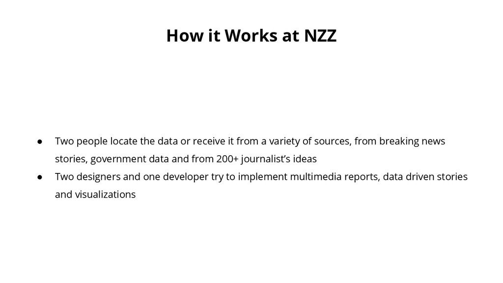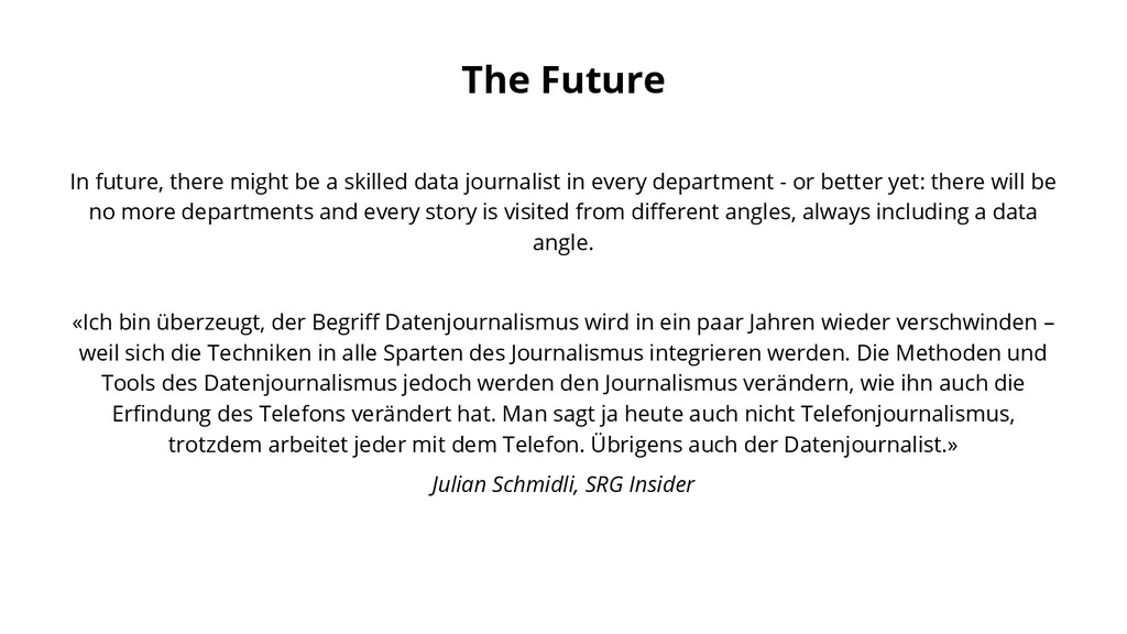 every department - or better yet: there will be no more departments and every story is visited from different angles, always including a data angle. «Ich bin überzeugt, der Begriff Datenjournalismus wird in ein paar Jahren wieder verschwinden – weil sich die Techniken in alle Sparten des Journalismus integrieren werden. Die Methoden und Tools des Datenjournalismus jedoch werden den Journalismus verändern, wie ihn auch die Erfindung des Telefons verändert hat. Man sagt ja heute auch nicht Telefonjournalismus, trotzdem arbeitet jeder mit dem Telefon. Übrigens auch der Datenjournalist.» Julian Schmidli, SRG Insider The Future