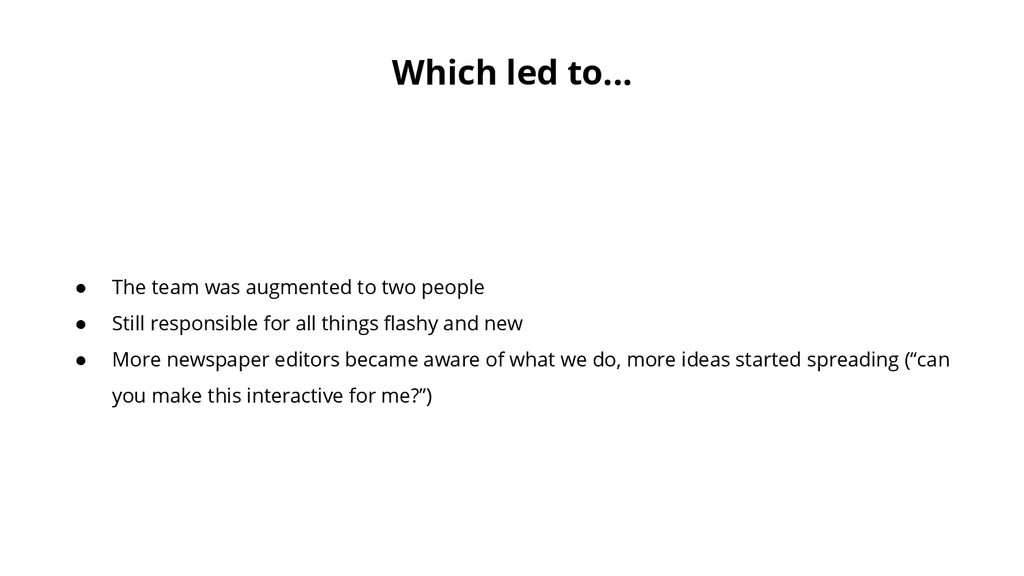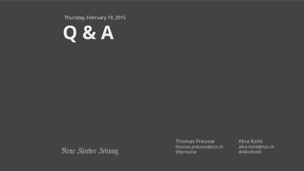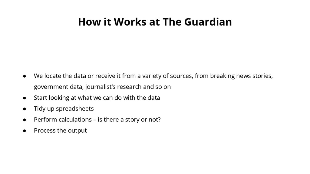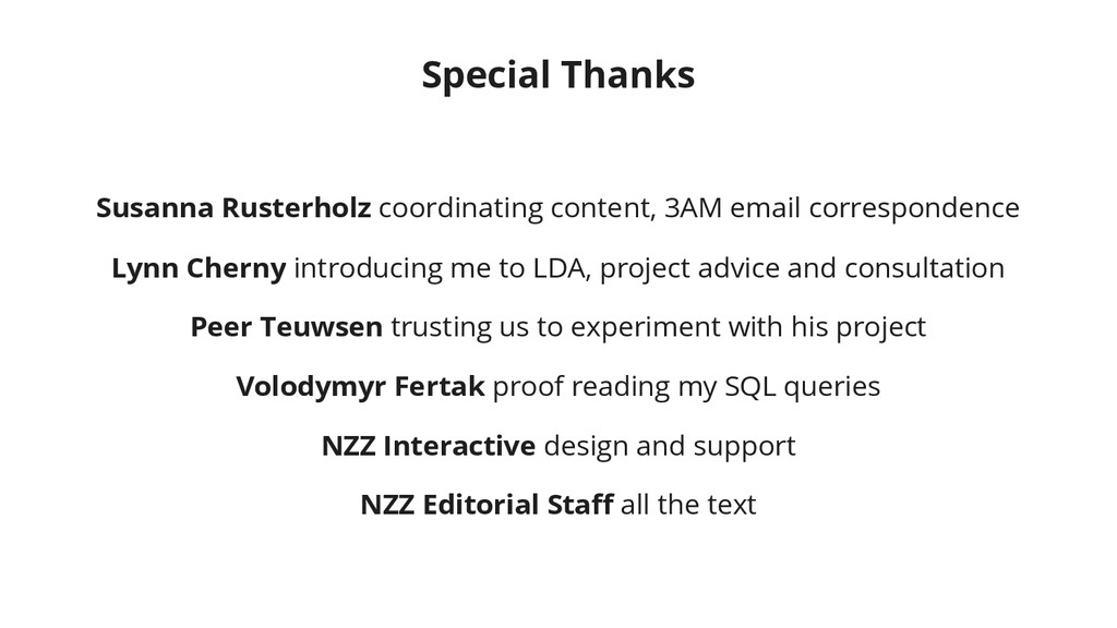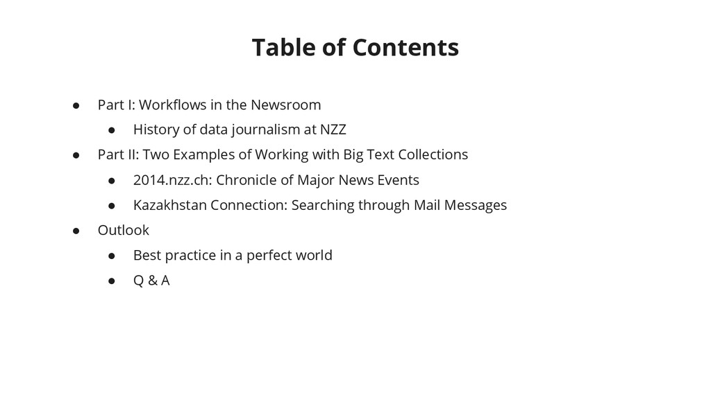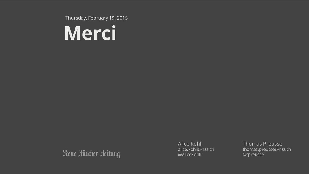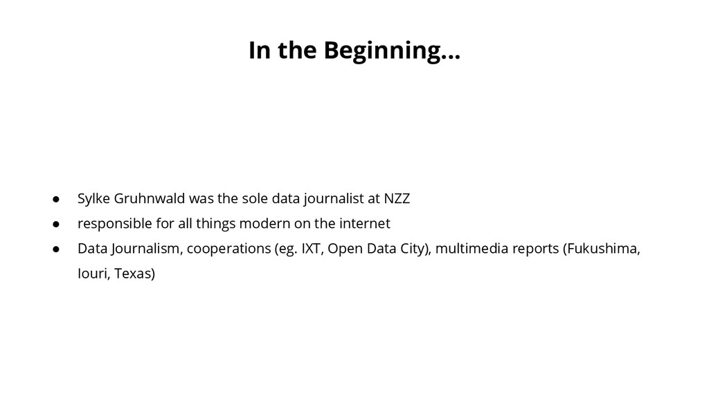 every department - or better yet: there will be no more departments and every story is visited from different angles, always including a data angle. «Ich bin überzeugt, der Begriff Datenjournalismus wird in ein paar Jahren wieder verschwinden – weil sich die Techniken in alle Sparten des Journalismus integrieren werden. Die Methoden und Tools des Datenjournalismus jedoch werden den Journalismus verändern, wie ihn auch die Erfindung des Telefons verändert hat. Man sagt ja heute auch nicht Telefonjournalismus, trotzdem arbeitet jeder mit dem Telefon. Übrigens auch der Datenjournalist.» Julian Schmidli, SRG Insider The Future