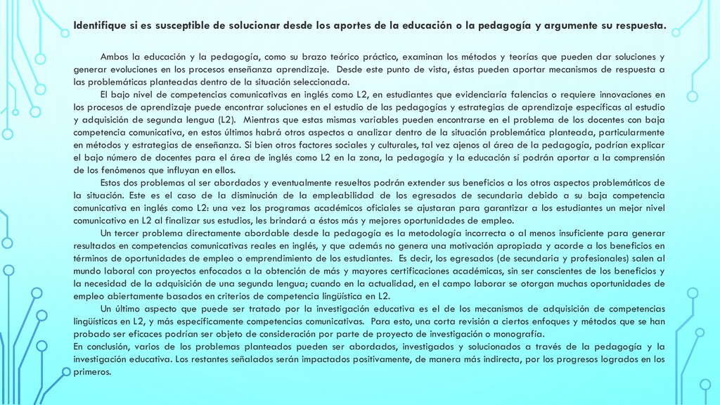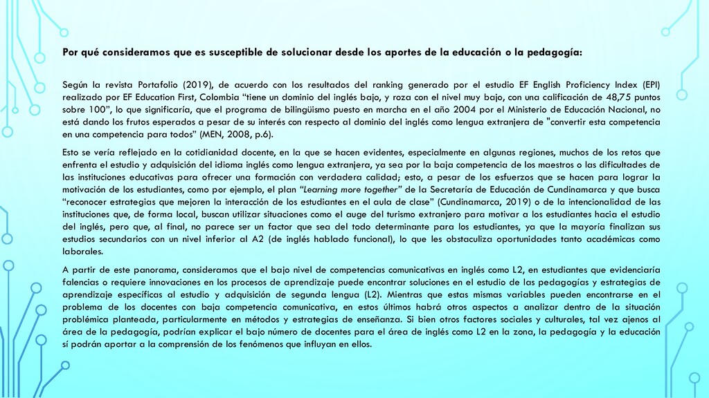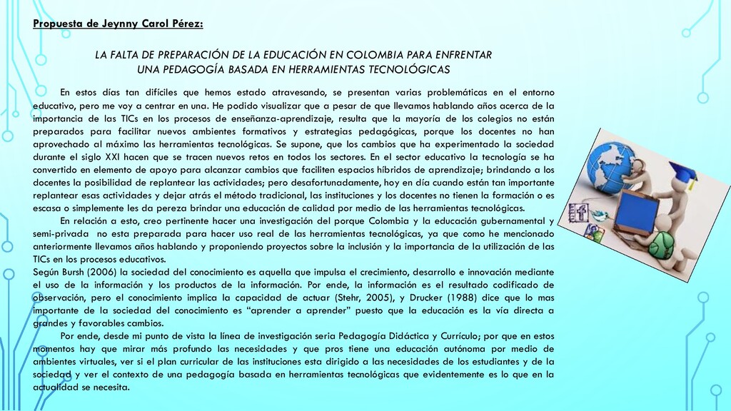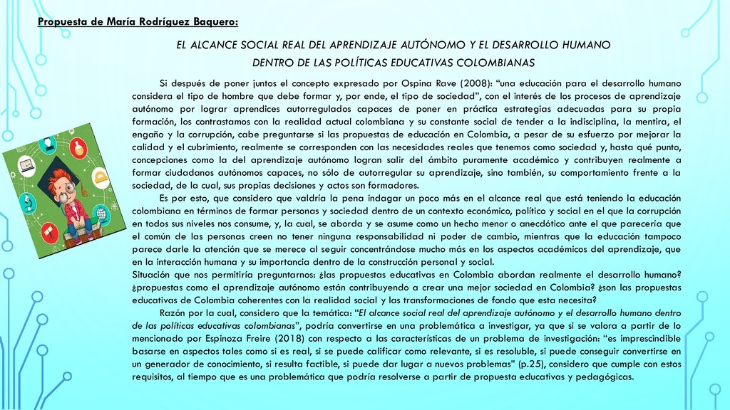 el concepto expresado por Ospina Rave (2008): “una educación para el desarrollo humano considera el tipo de hombre que debe formar y, por ende, el tipo de sociedad”, con el interés de los procesos de aprendizaje autónomo por lograr aprendices autorregulados capaces de poner en práctica estrategias adecuadas para su propia formación, los contrastamos con la realidad actual colombiana y su constante social de tender a la indisciplina, la mentira, el engaño y la corrupción, cabe preguntarse si las propuestas de educación en Colombia, a pesar de su esfuerzo por mejorar la calidad y el cubrimiento, realmente se corresponden con las necesidades reales que tenemos como sociedad y, hasta qué punto, concepciones como la del aprendizaje autónomo logran salir del ámbito puramente académico y contribuyen realmente a formar ciudadanos autónomos capaces, no sólo de autorregular su aprendizaje, sino también, su comportamiento frente a la sociedad, de la cual, sus propias decisiones y actos son formadores. Es por esto, que considero que valdría la pena indagar un poco más en el alcance real que está teniendo la educación colombiana en términos de formar personas y sociedad dentro de un contexto económico, político y social en el que la corrupción en todos sus niveles nos consume, y, la cual, se aborda y se asume como un hecho menor o anecdótico ante el que parecería que el común de las personas creen no tener ninguna responsabilidad ni poder de cambio, mientras que la educación tampoco parece darle la atención que se merece al seguir concentrándose mucho más en los aspectos académicos del aprendizaje, que en la interacción humana y su importancia dentro de la construcción personal y social. Situación que nos permitiría preguntarnos: ¿las propuestas educativas en Colombia abordan realmente el desarrollo humano? ¿propuestas como el aprendizaje autónomo están contribuyendo a crear una mejor sociedad en Colombia? ¿son las propuestas educativas de Colombia coherentes con la realidad social y las transformaciones de fondo que esta necesita? Razón por la cual, considero que la temática: “El alcance social real del aprendizaje autónomo y el desarrollo humano dentro de las políticas educativas colombianas”, podría convertirse en una problemática a investigar, ya que si se valora a partir de lo mencionado por Espinoza Freire (2018) con respecto a las características de un problema de investigación: “es imprescindible basarse en aspectos tales como si es real, si se puede calificar como relevante, si es resoluble, si puede conseguir convertirse en un generador de conocimiento, si resulta factible, si puede dar lugar a nuevos problemas” (p.25), considero que cumple con estos requisitos, al tiempo que es una problemática que podría resolverse a partir de propuesta educativas y pedagógicas. EL ALCANCE SOCIAL REAL DEL APRENDIZAJE AUTÓNOMO Y EL DESARROLLO HUMANO DENTRO DE LAS POLÍTICAS EDUCATIVAS COLOMBIANAS