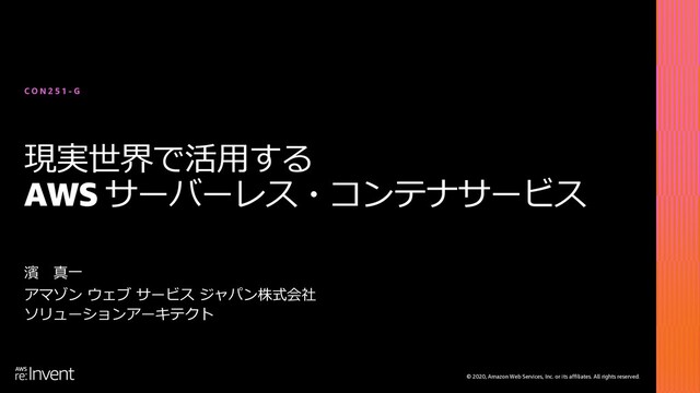 rights reserved. 現実世界で活⽤する AWS サーバーレス・コンテナサービス 濱 真⼀ アマゾン ウェブ サービス ジャパン株式会社 ソリューションアーキテクト C O N 2 5 1 - G