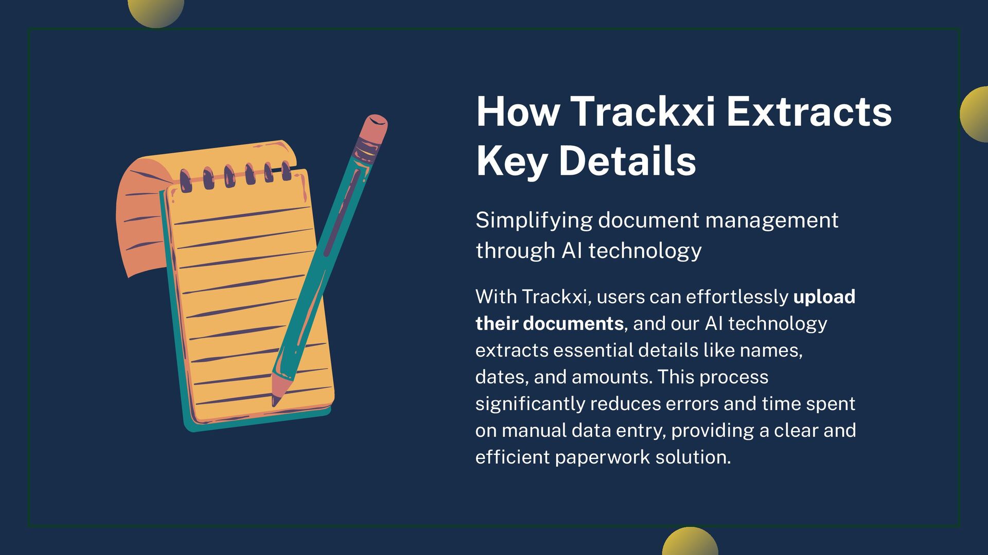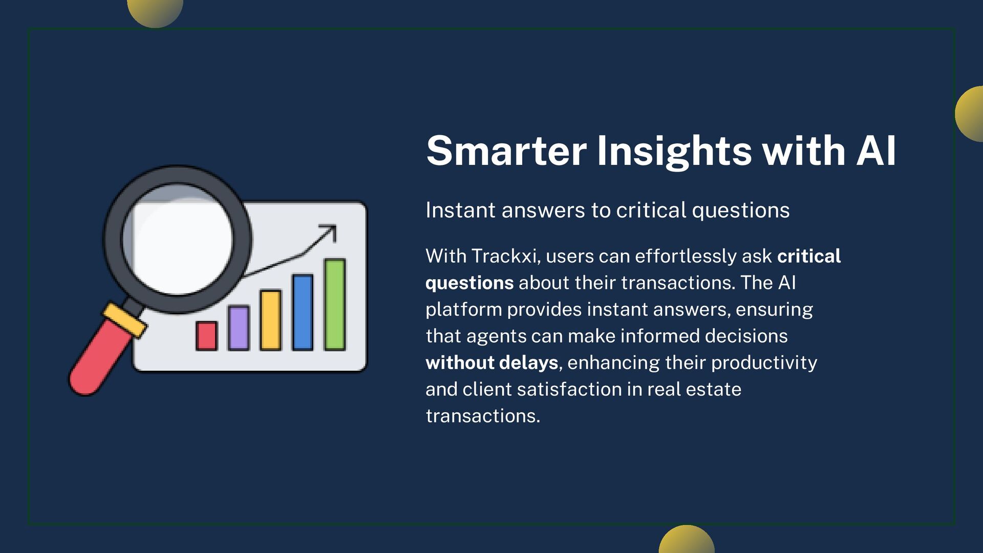 From document chaos to smart automation, Trackxi’s AI for real estate extracts key details, answers your transaction questions, and streamlines every step — saving time and reducing errors.