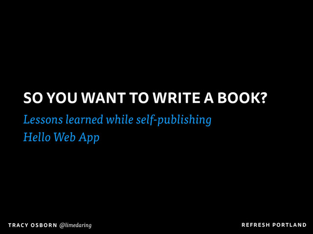 Considering writing a book? These slides are from my presentation at Refresh Portland about the process of writing Hello Web App (http://hellowebapp.com) and the lessons I learned from a year of writing and marketing.