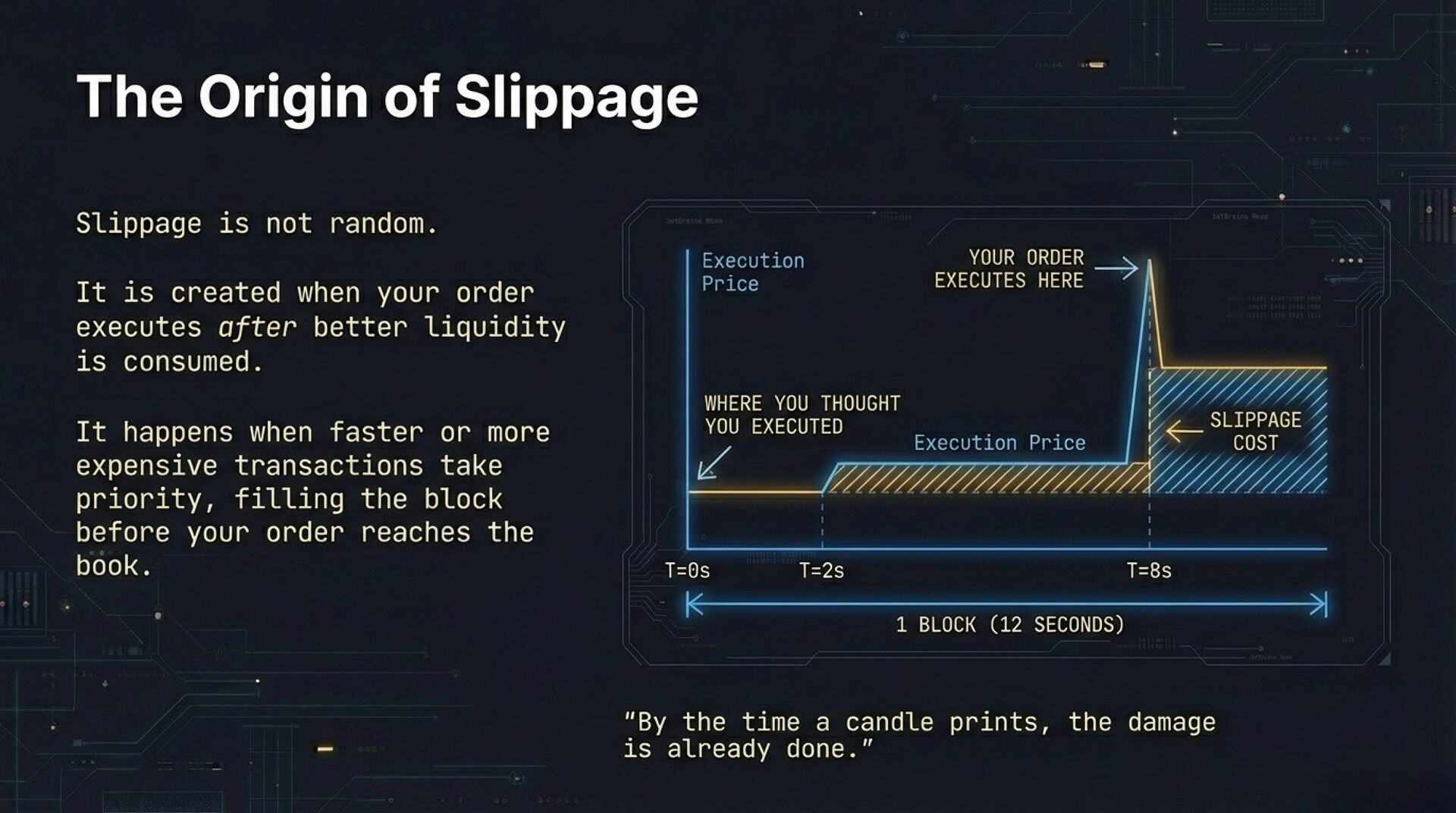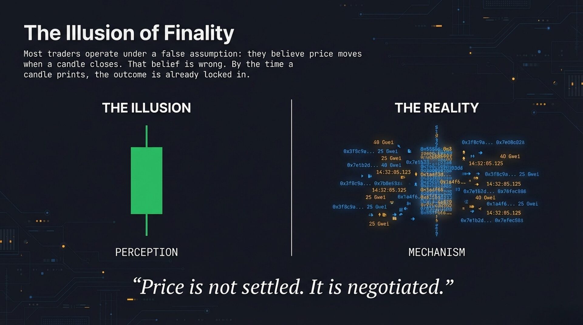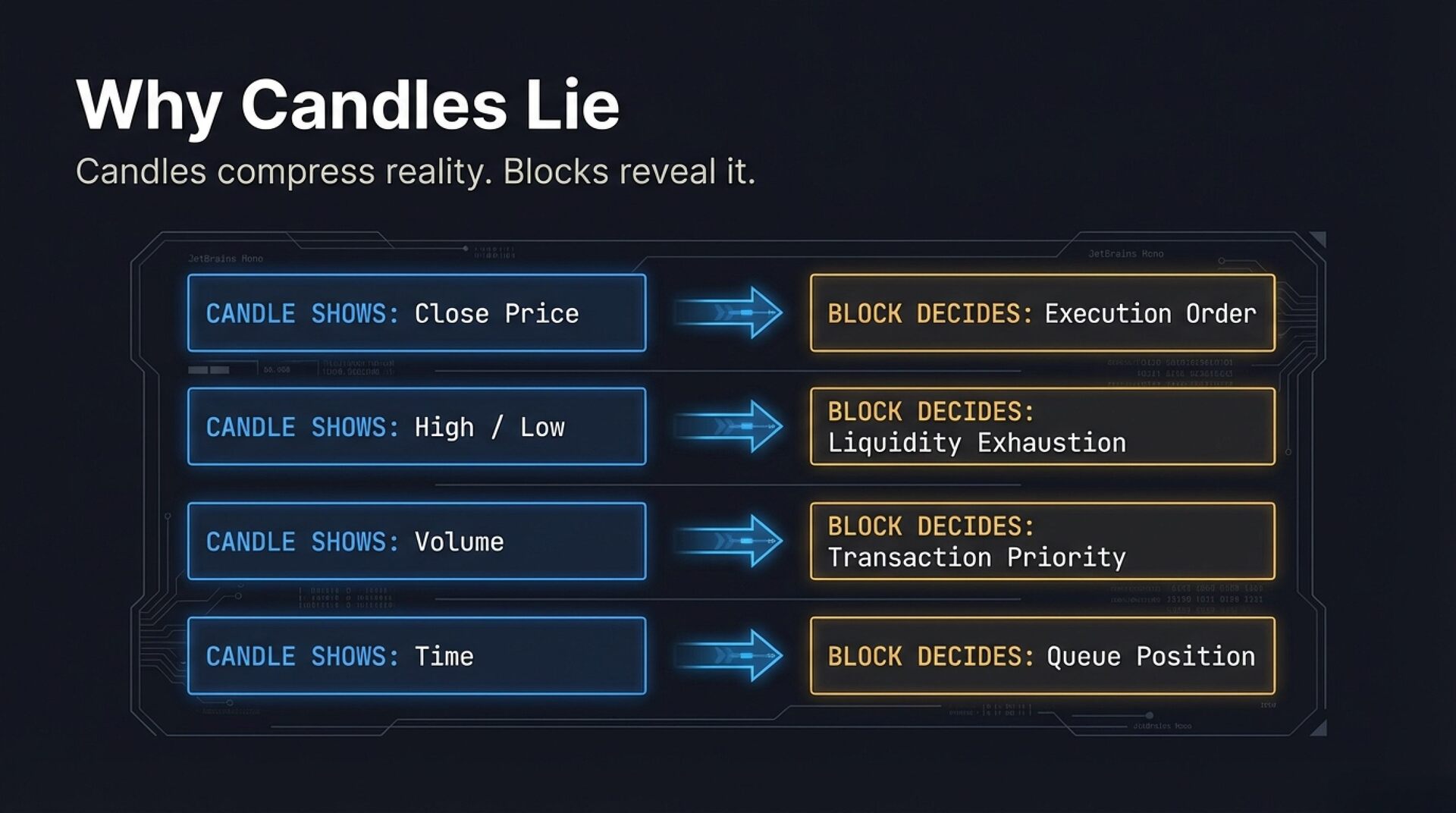 By the time a candle prints, the outcome is already locked in. Liquidity has been consumed, slippage has been assigned, and execution costs have been paid. Charts show where price ended — not how it got there. Many traders don’t lose because their signal was wrong, but because they arrived too slow, too late, or too cheap inside the block.