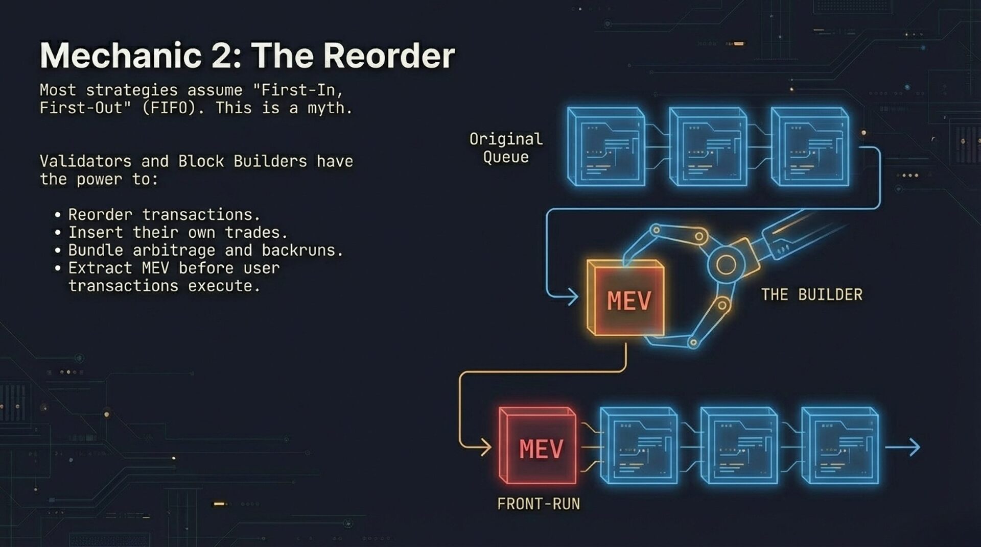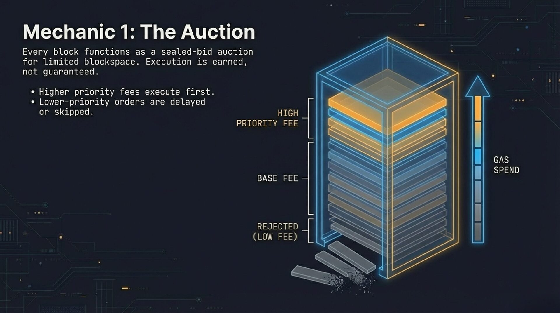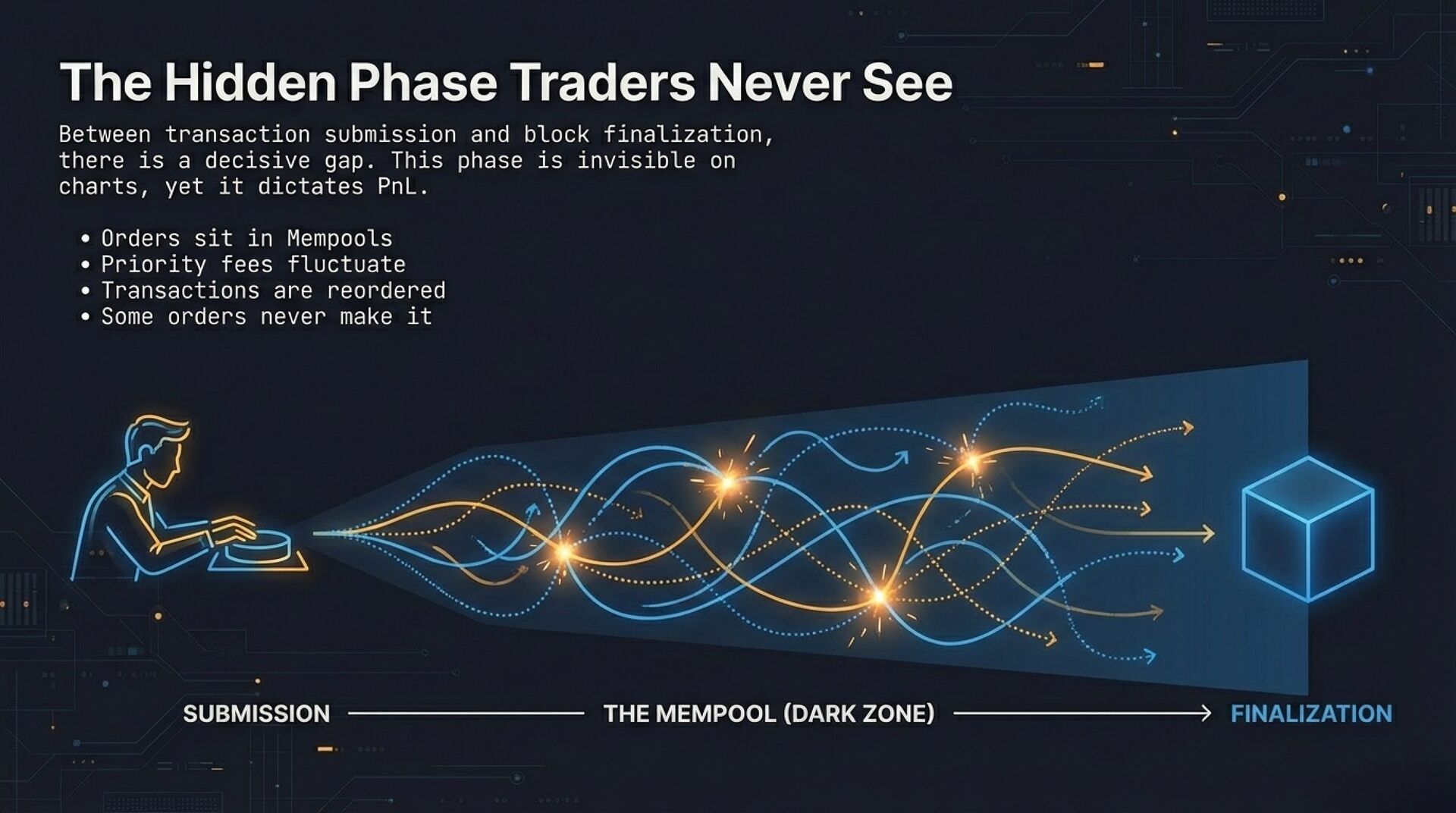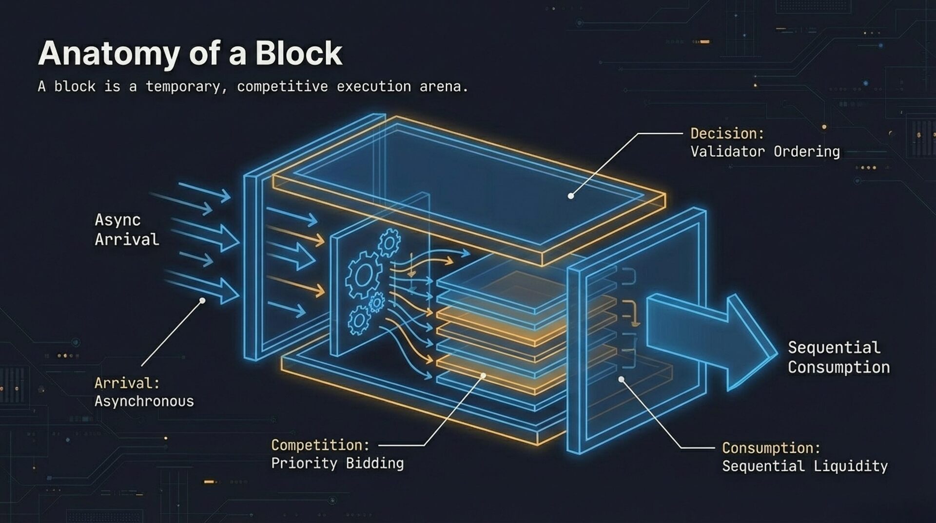 Inside every block, before finalization, a silent battle takes place. Orders don’t execute fairly or sequentially; they compete. Priority fees rise like bids in an auction. Transactions fight for position. Validators and block builders don’t simply confirm trades — they actively shape execution. Some orders jump the queue, others stall, and many never make it into the block at all.