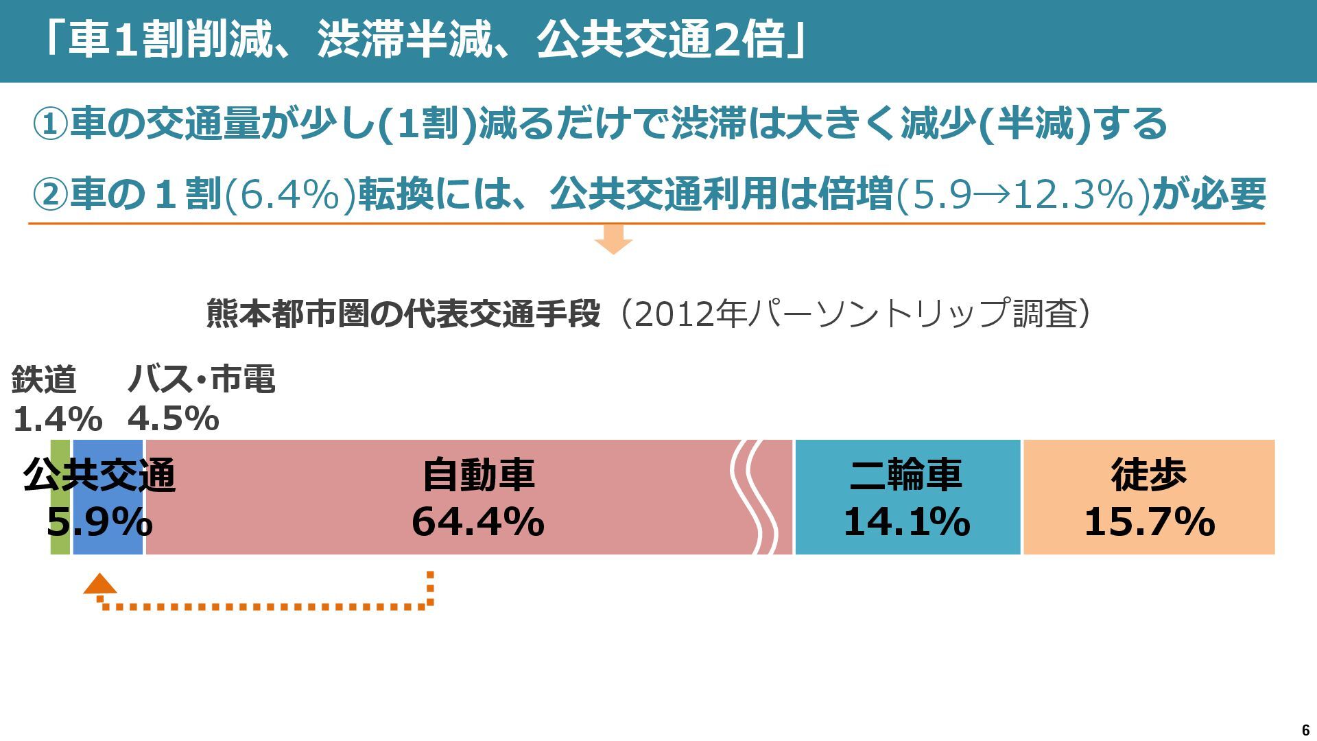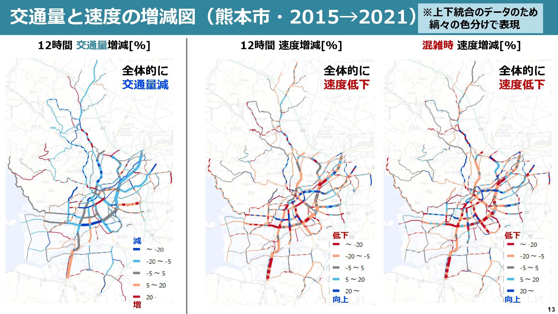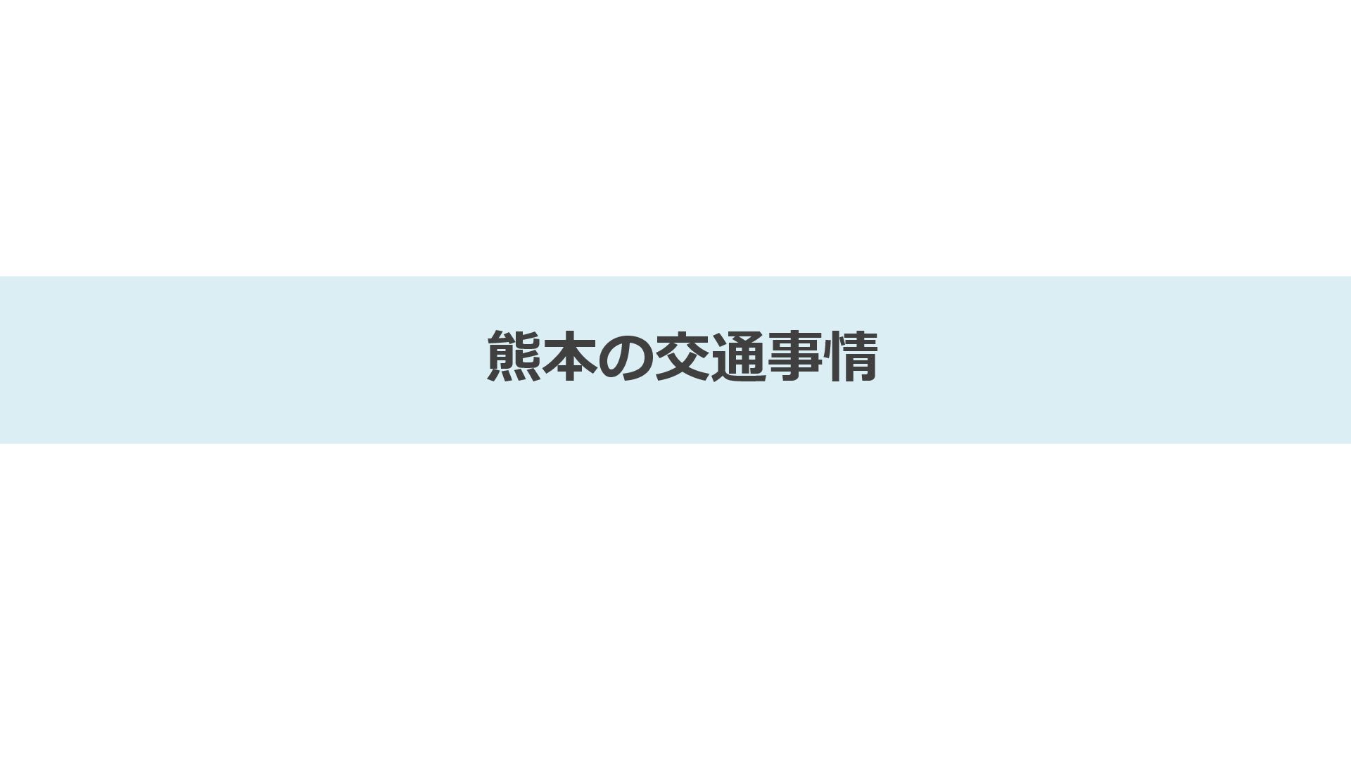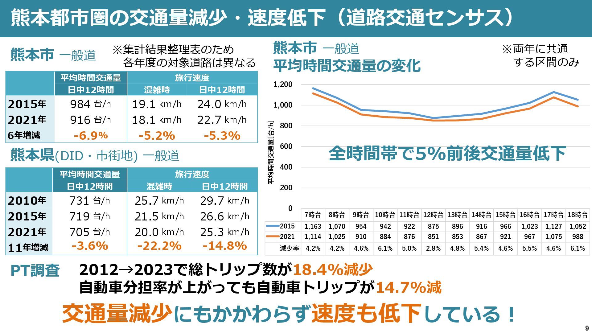 19.1 km/h 24.0 km/h 2021年 916 台/h 18.1 km/h 22.7 km/h 6年増減 -6.9% -5.2% -5.3% 平均時間交通量 旅行速度 日中12時間 混雑時 日中12時間 2010年 731 台/h 25.7 km/h 29.7 km/h 2015年 719 台/h 21.5 km/h 26.6 km/h 2021年 705 台/h 20.0 km/h 25.3 km/h 11年増減 -3.6% -22.2% -14.8% 7時台 8時台 9時台 10時台 11時台 12時台 13時台 14時台 15時台 16時台 17時台 18時台 2015 1,163 1,070 954 942 922 875 896 916 966 1,023 1,127 1,052 2021 1,114 1,025 910 884 876 851 853 867 921 967 1,075 988 減少率 4.2% 4.2% 4.6% 6.1% 5.0% 2.8% 4.8% 5.4% 4.6% 5.5% 4.6% 6.1% 0 200 400 600 800 1,000 1,200 平均時間交通量[台/h] 熊本市 一般道 熊本県(DID・市街地) 一般道 ※集計結果整理表のため 各年度の対象道路は異なる ※両年に共通 する区間のみ 熊本市 一般道 平均時間交通量の変化 交通量減少にもかかわらず速度も低下している! 全時間帯で5%前後交通量低下 2012→2023で総トリップ数が18.4%減少 自動車分担率が上がっても自動車トリップが14.7%減 PT調査