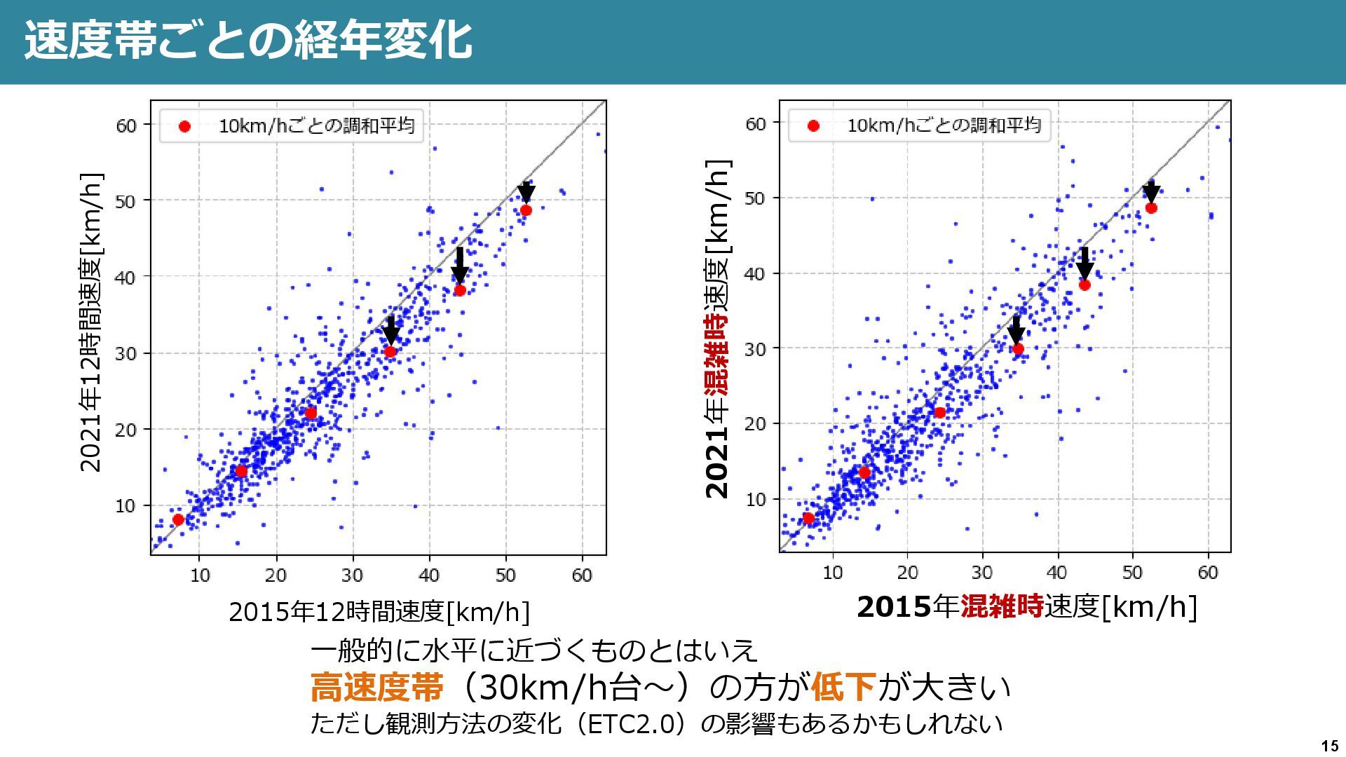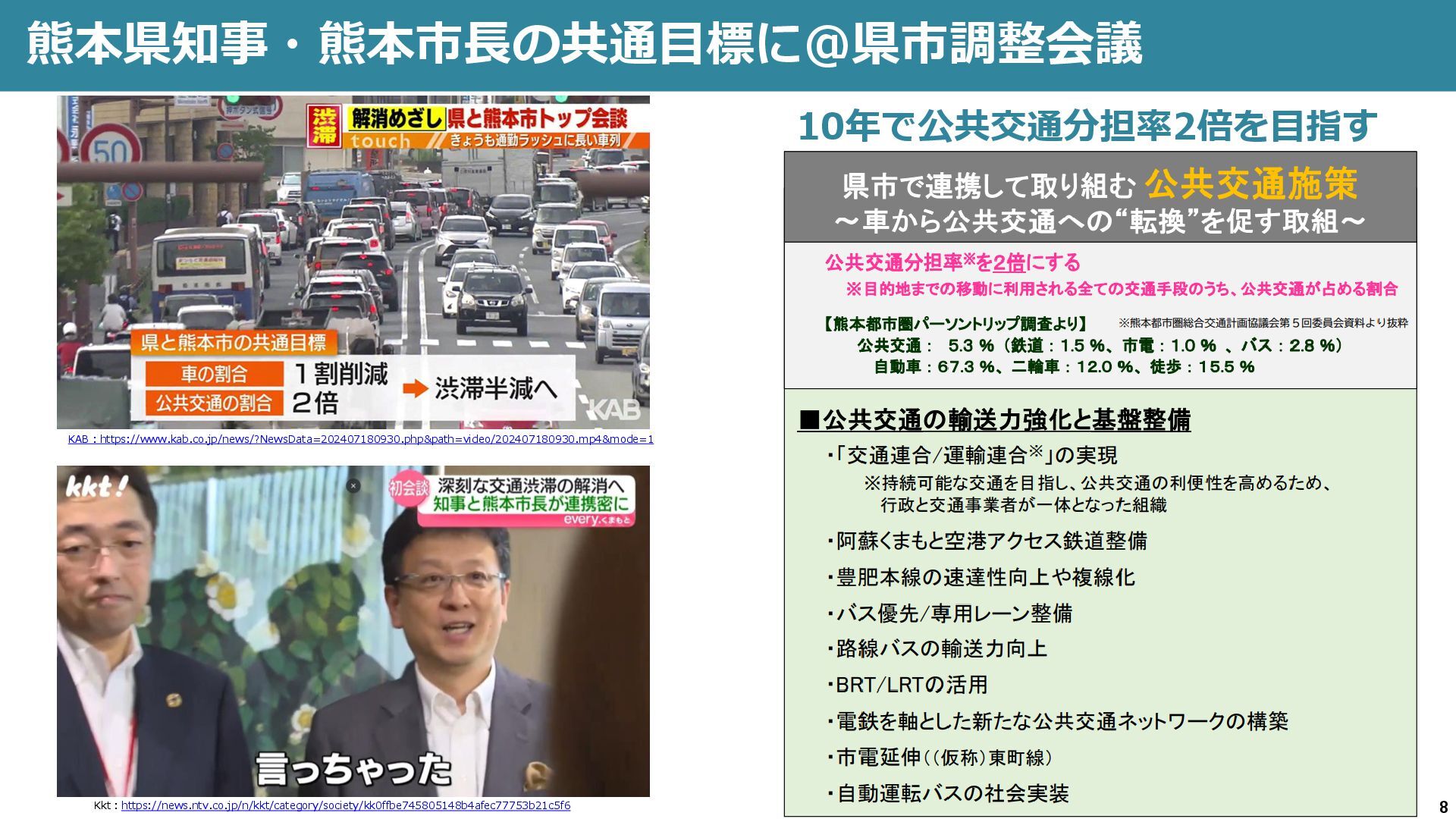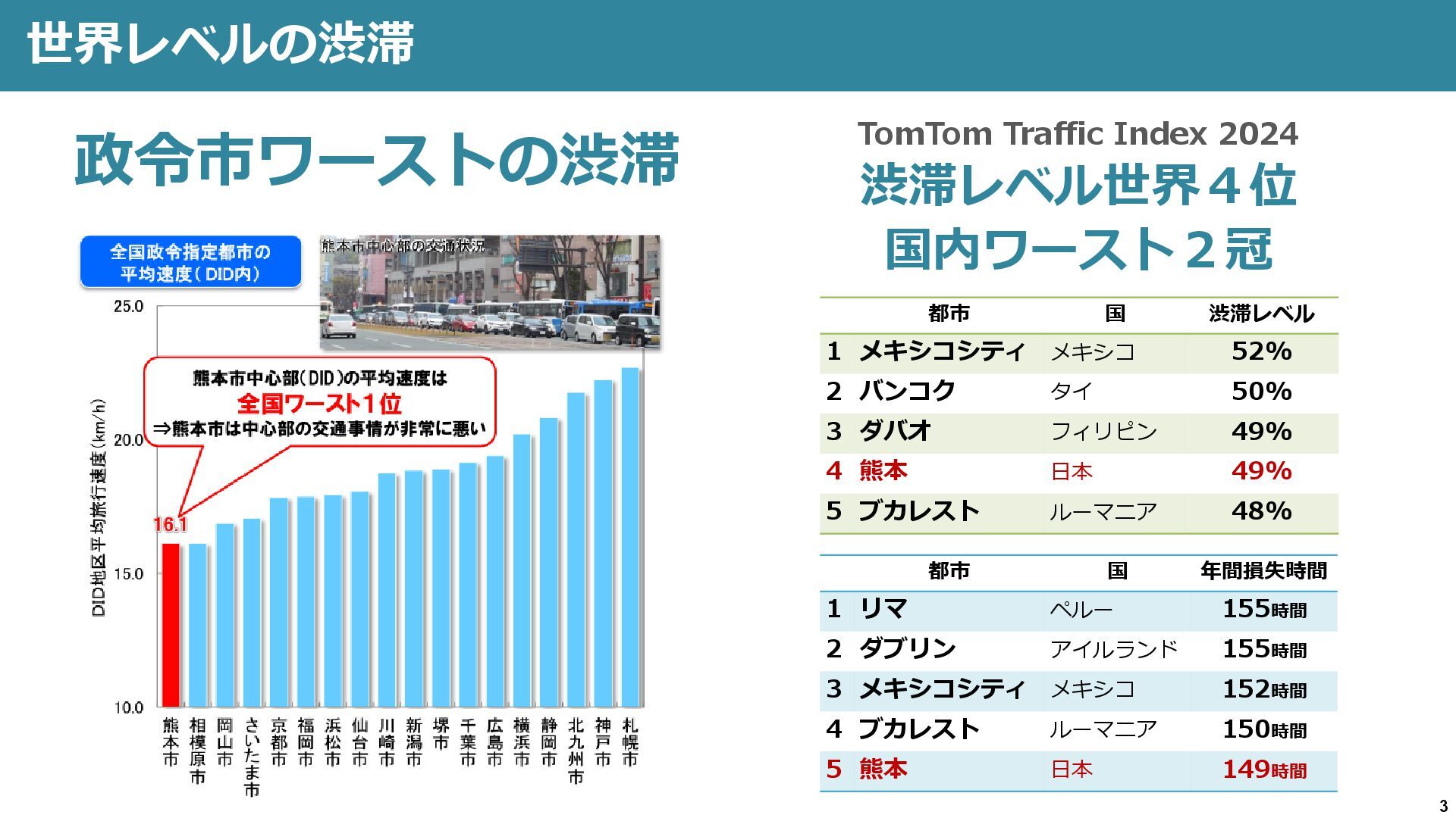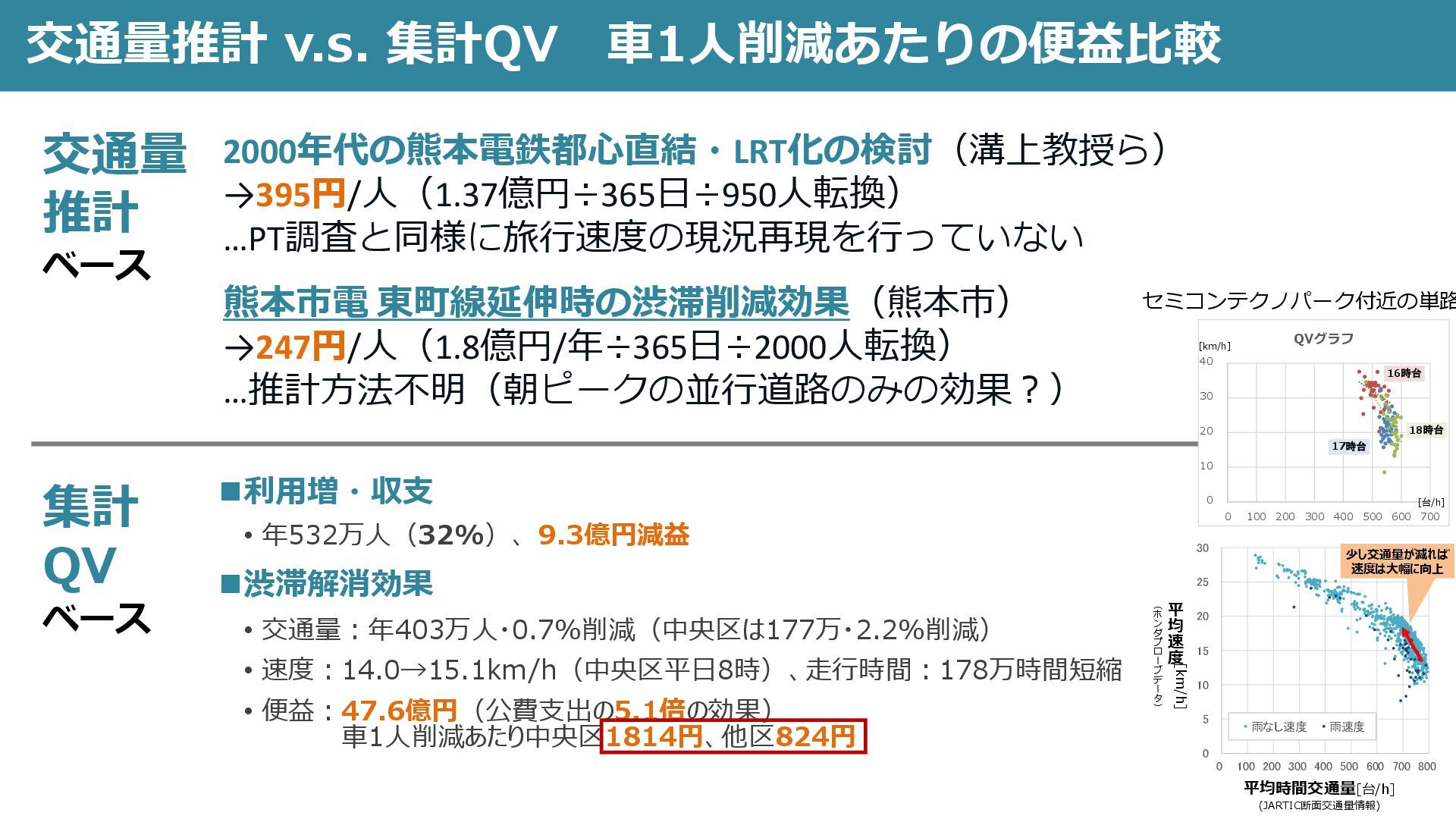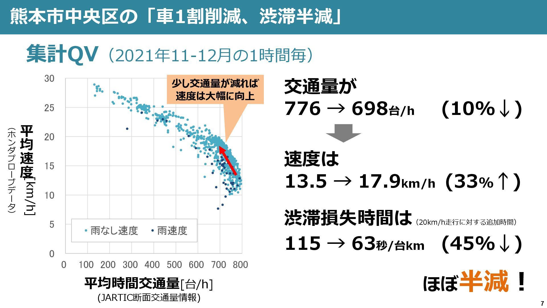 19.1 km/h 24.0 km/h 2021年 916 台/h 18.1 km/h 22.7 km/h 6年増減 -6.9% -5.2% -5.3% 平均時間交通量 旅行速度 日中12時間 混雑時 日中12時間 2010年 731 台/h 25.7 km/h 29.7 km/h 2015年 719 台/h 21.5 km/h 26.6 km/h 2021年 705 台/h 20.0 km/h 25.3 km/h 11年増減 -3.6% -22.2% -14.8% 7時台 8時台 9時台 10時台 11時台 12時台 13時台 14時台 15時台 16時台 17時台 18時台 2015 1,163 1,070 954 942 922 875 896 916 966 1,023 1,127 1,052 2021 1,114 1,025 910 884 876 851 853 867 921 967 1,075 988 減少率 4.2% 4.2% 4.6% 6.1% 5.0% 2.8% 4.8% 5.4% 4.6% 5.5% 4.6% 6.1% 0 200 400 600 800 1,000 1,200 平均時間交通量[台/h] 熊本市 一般道 熊本県(DID・市街地) 一般道 ※集計結果整理表のため 各年度の対象道路は異なる ※両年に共通 する区間のみ 熊本市 一般道 平均時間交通量の変化 交通量減少にもかかわらず速度も低下している! 全時間帯で5%前後交通量低下 2012→2023で総トリップ数が18.4%減少 自動車分担率が上がっても自動車トリップが14.7%減 PT調査