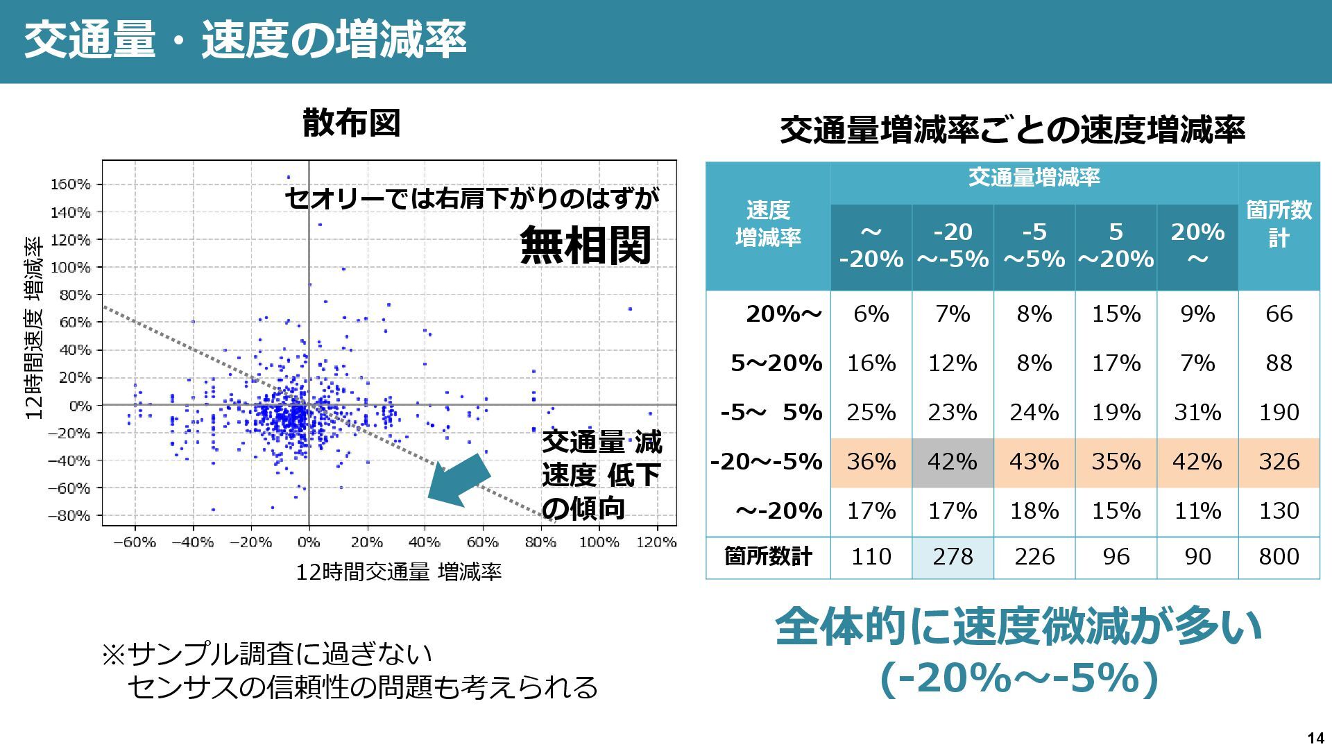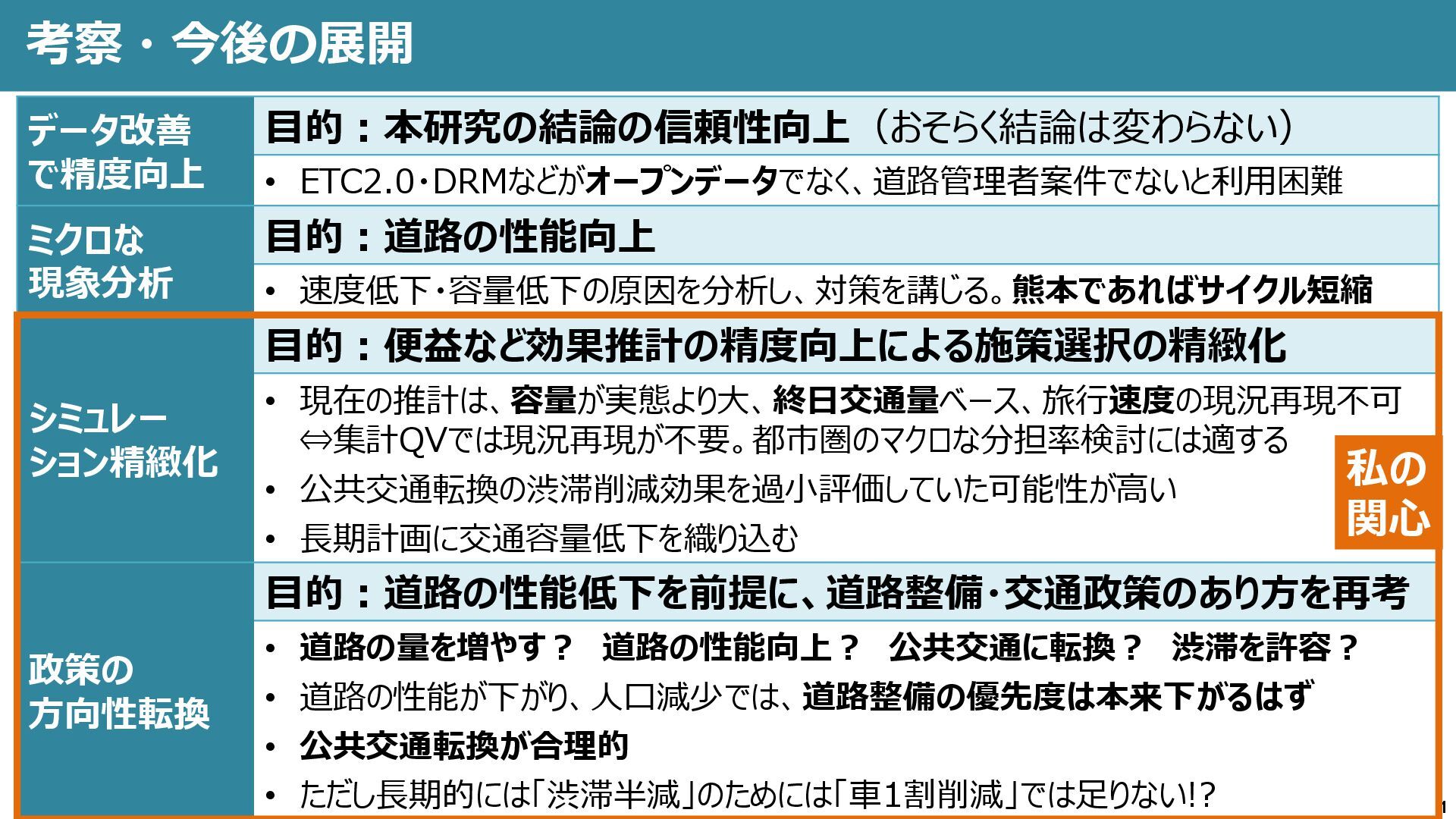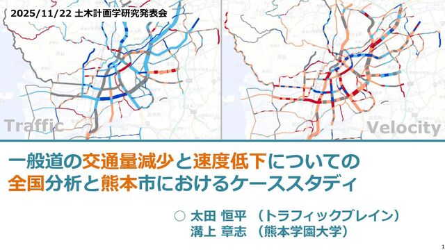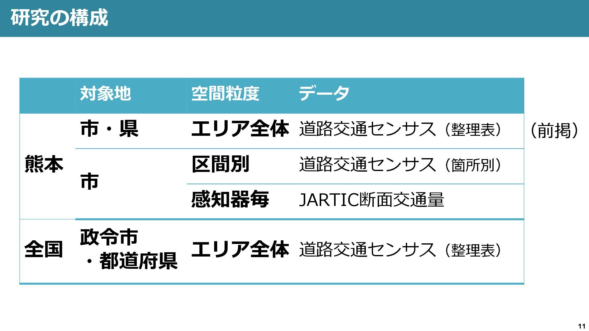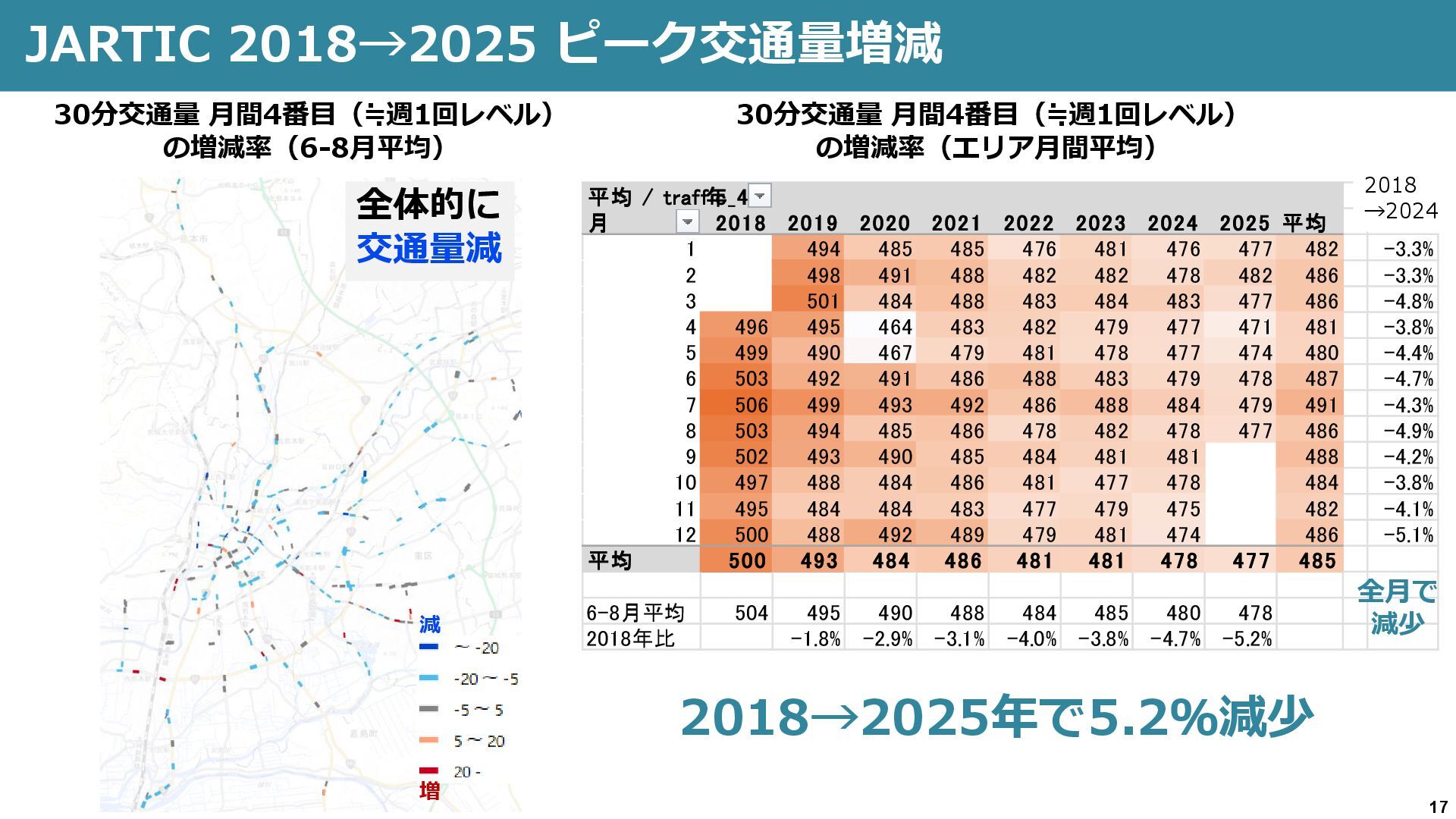 19.1 km/h 24.0 km/h 2021年 916 台/h 18.1 km/h 22.7 km/h 6年増減 -6.9% -5.2% -5.3% 平均時間交通量 旅行速度 日中12時間 混雑時 日中12時間 2010年 731 台/h 25.7 km/h 29.7 km/h 2015年 719 台/h 21.5 km/h 26.6 km/h 2021年 705 台/h 20.0 km/h 25.3 km/h 11年増減 -3.6% -22.2% -14.8% 7時台 8時台 9時台 10時台 11時台 12時台 13時台 14時台 15時台 16時台 17時台 18時台 2015 1,163 1,070 954 942 922 875 896 916 966 1,023 1,127 1,052 2021 1,114 1,025 910 884 876 851 853 867 921 967 1,075 988 減少率 4.2% 4.2% 4.6% 6.1% 5.0% 2.8% 4.8% 5.4% 4.6% 5.5% 4.6% 6.1% 0 200 400 600 800 1,000 1,200 平均時間交通量[台/h] 熊本市 一般道 熊本県(DID・市街地) 一般道 ※集計結果整理表のため 各年度の対象道路は異なる ※両年に共通 する区間のみ 熊本市 一般道 平均時間交通量の変化 交通量減少にもかかわらず速度も低下している! 全時間帯で5%前後交通量低下 2012→2023で総トリップ数が18.4%減少 自動車分担率が上がっても自動車トリップが14.7%減 PT調査
