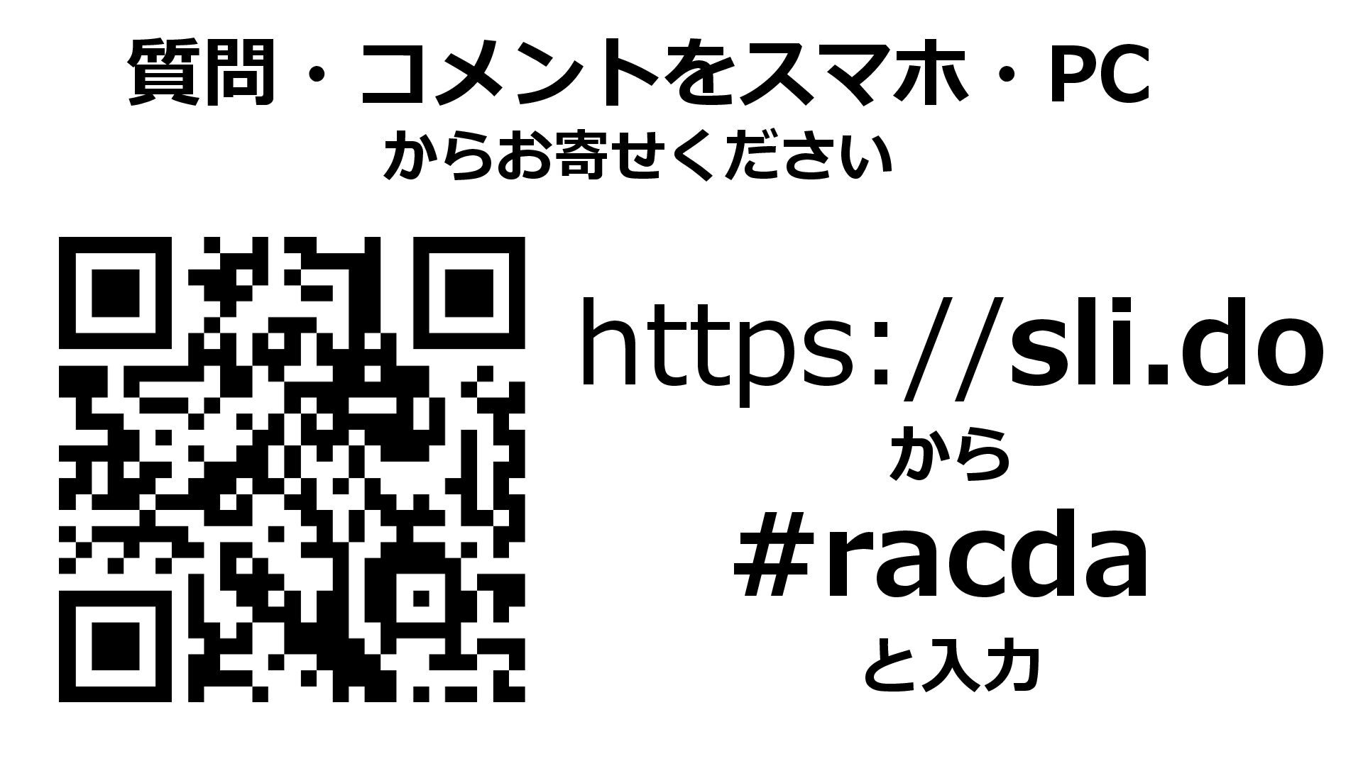 質問・コメントをスマホ・PC からお寄せください https://sli.do から #racda と⼊⼒