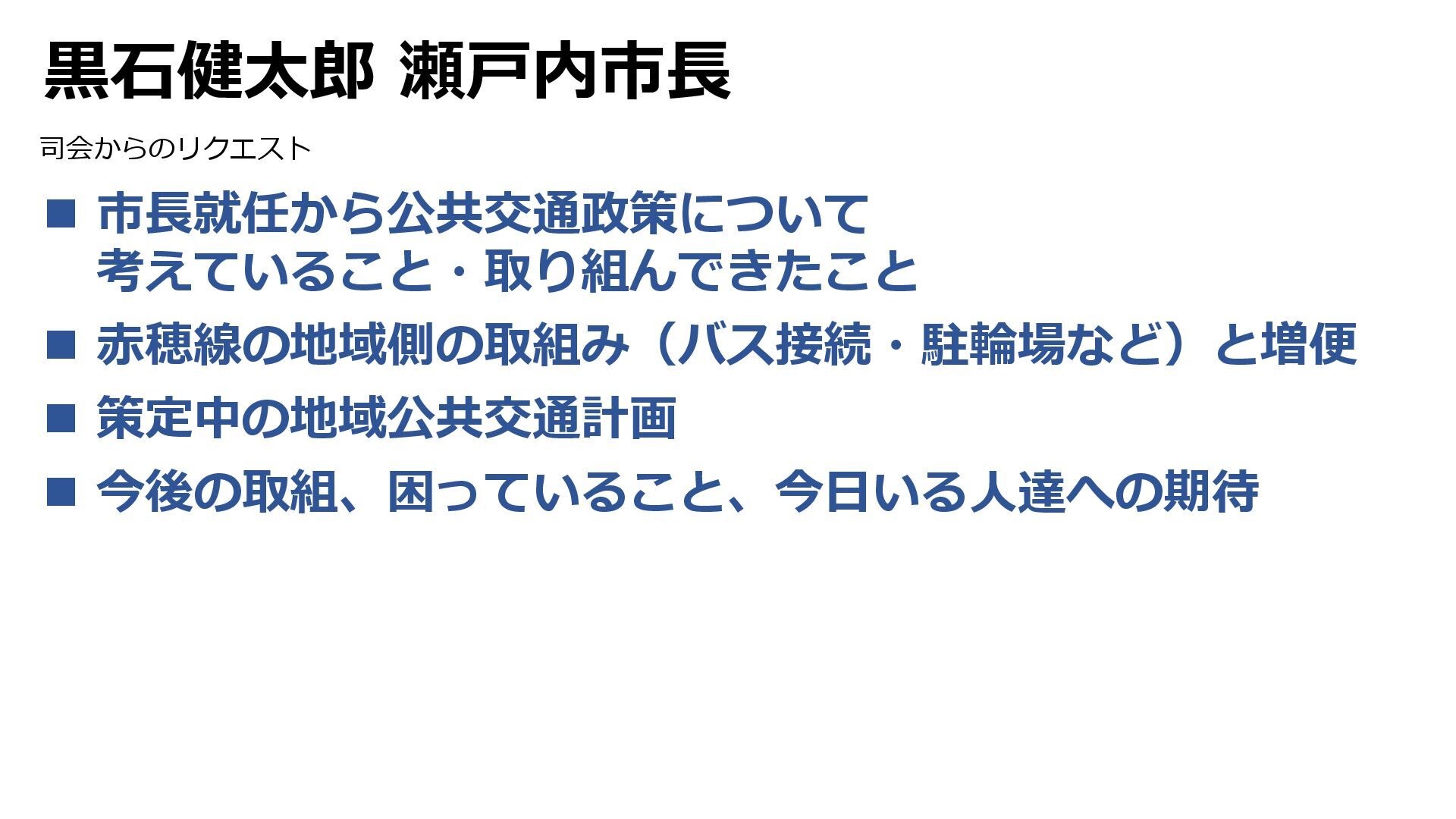 ⿊⽯健太郎 瀬⼾内市⻑ 市⻑就任から公共交通政策について 考えていること・取り組んできたこと ⾚穂線の地域側の取組み(バス接続・駐輪場など)と増便 策定中の地域公共交通計画