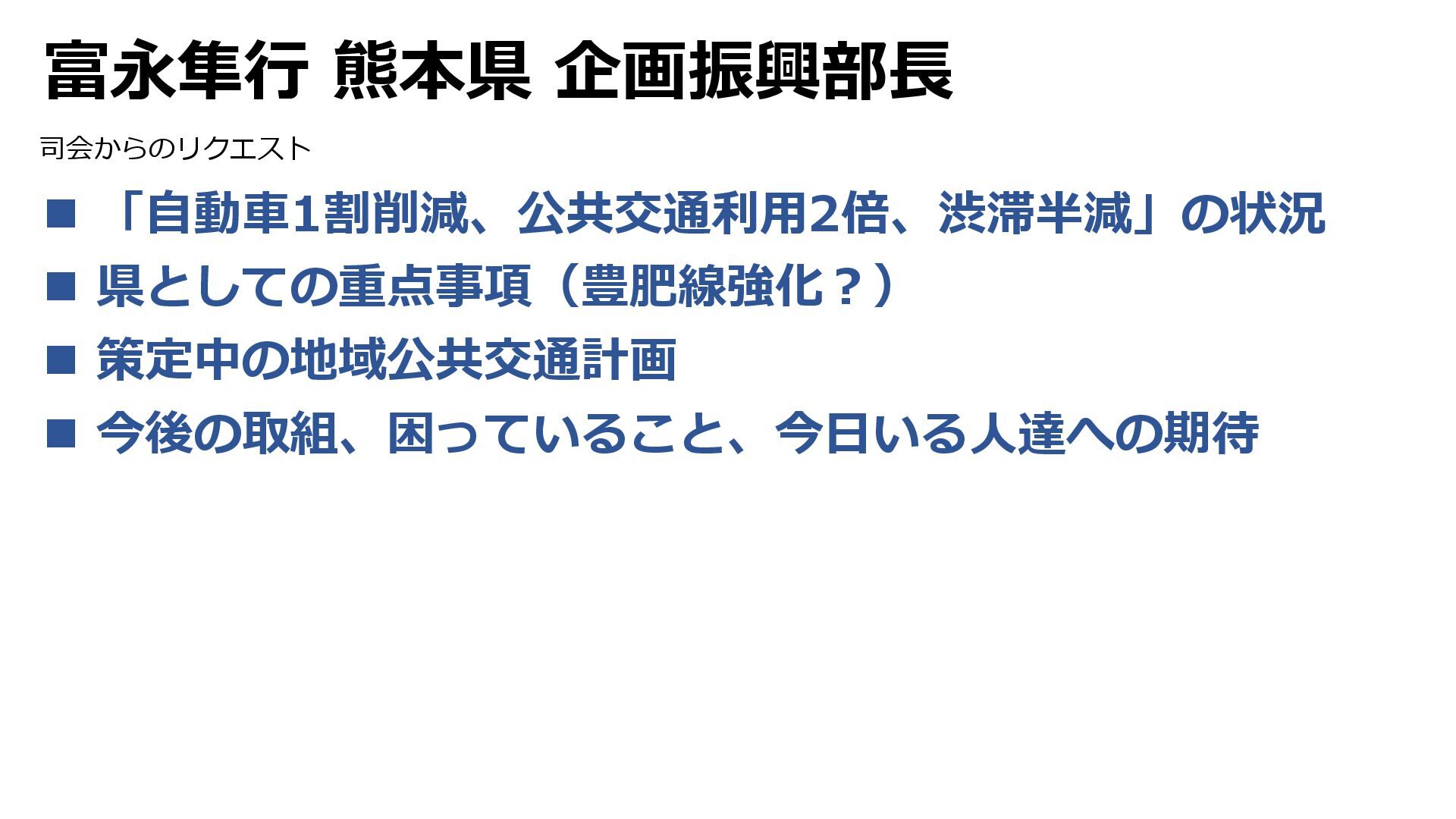 富永隼⾏ 熊本県 企画振興部⻑ 「⾃動⾞1割削減、公共交通利⽤2倍、渋滞半減」の状況 県としての重点事項(豊肥線強化︖) 策定中の地域公共交通計画