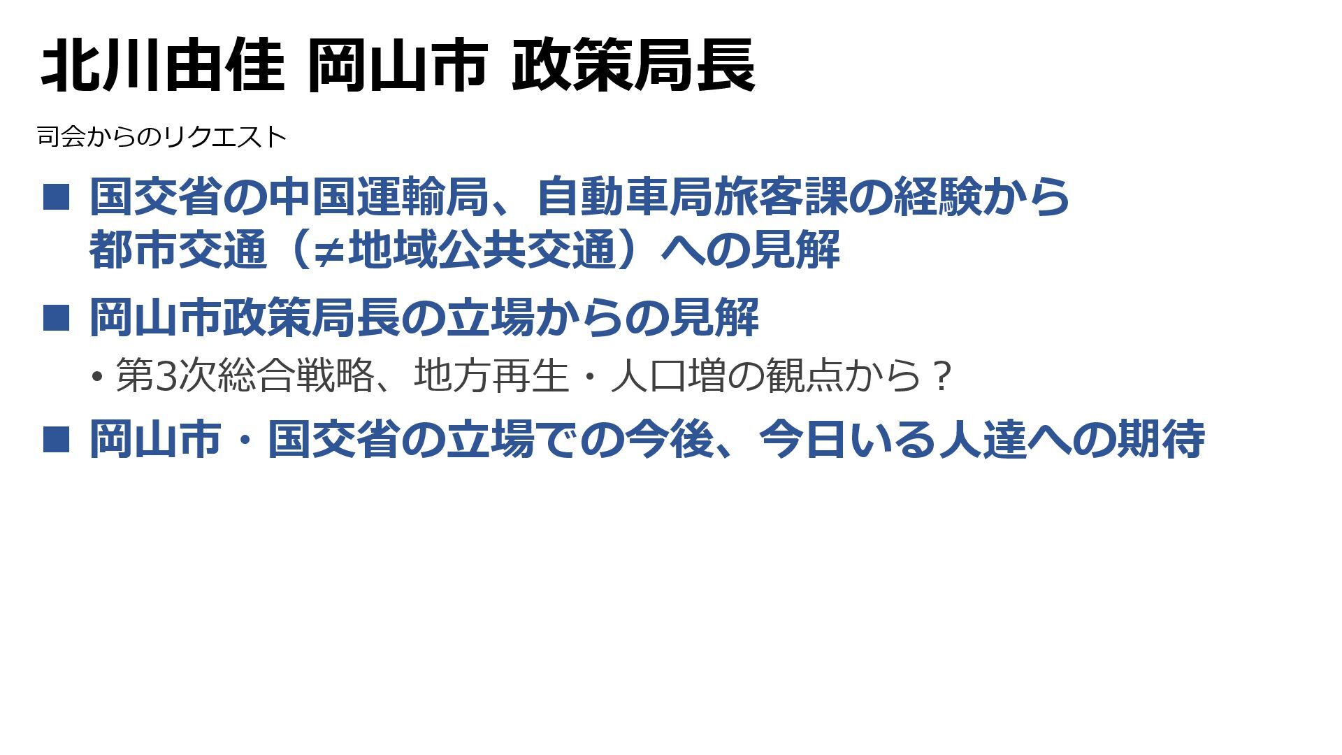 北川由佳 岡⼭市 政策局⻑ 国交省の中国運輸局、⾃動⾞局旅客課の経験から 都市交通(≠地域公共交通)への⾒解 岡⼭市政策局⻑の⽴場からの⾒解 • 第3次総合戦略、地⽅再⽣・⼈⼝増の観点から︖