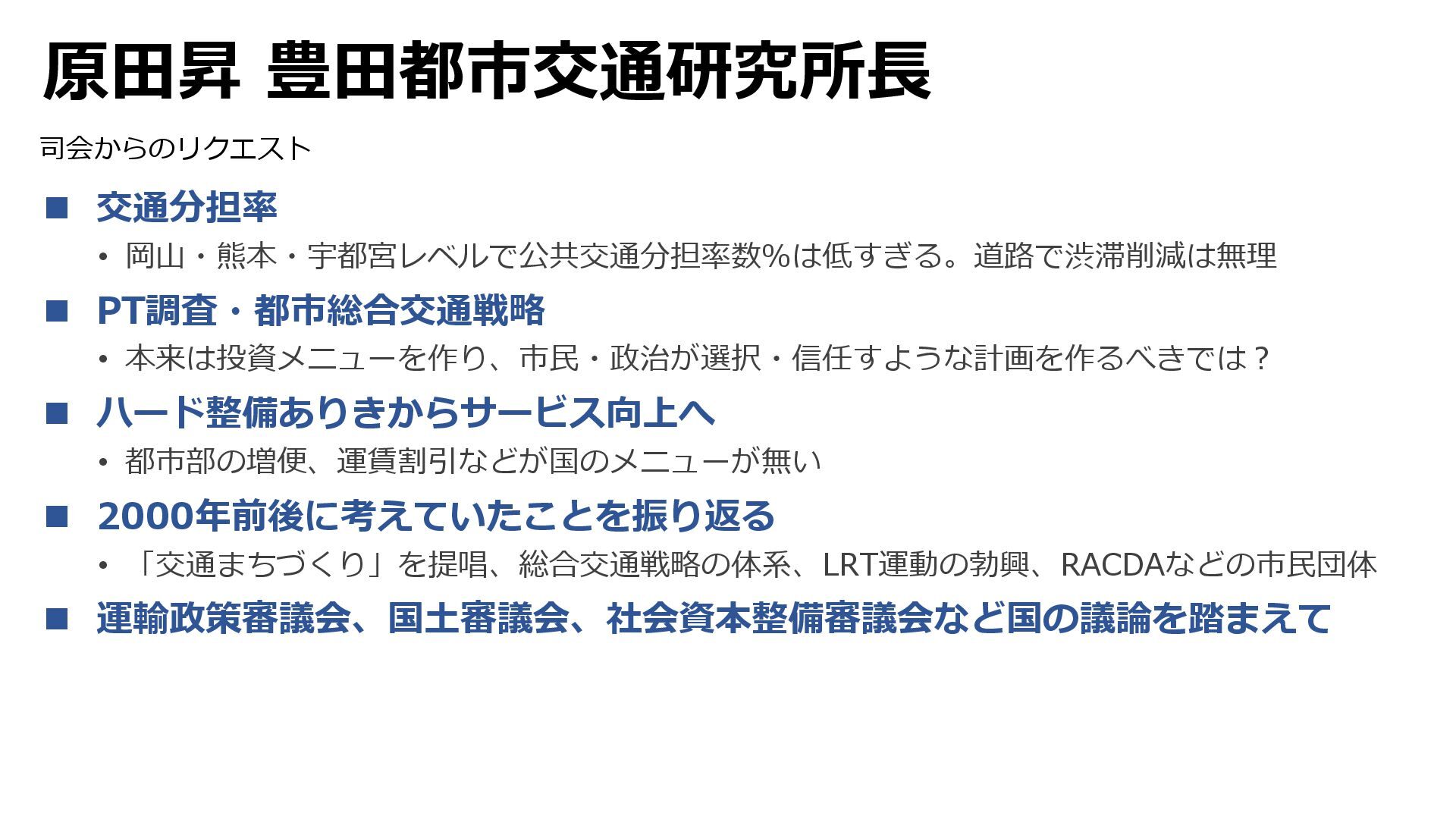 原⽥昇 豊⽥都市交通研究所⻑ 交通分担率 • 岡⼭・熊本・宇都宮レベルで公共交通分担率数%は低すぎる。道路で渋滞削減は無理 PT調査・都市総合交通戦略 • 本来は投資メニューを作り、市⺠・政治が選択・信任すような計画を作るべきでは︖