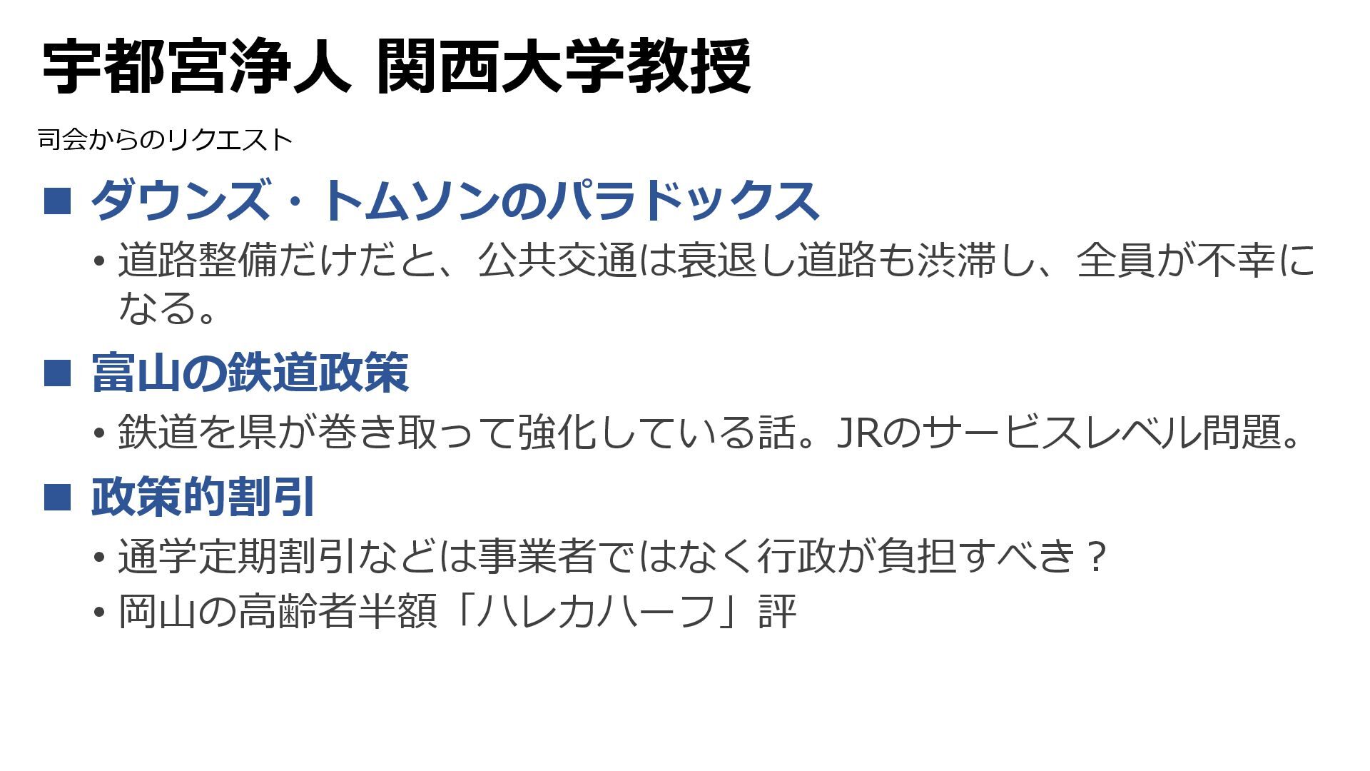 宇都宮浄⼈ 関⻄⼤学教授 ダウンズ・トムソンのパラドックス • 道路整備だけだと、公共交通は衰退し道路も渋滞し、全員が不幸に なる。 富⼭の鉄道政策 •
