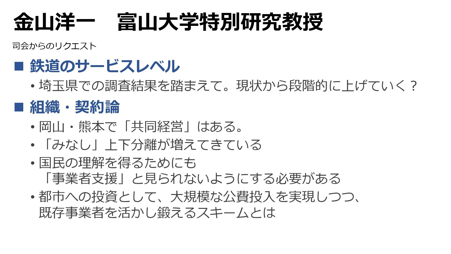 ⾦⼭洋⼀ 富⼭⼤学特別研究教授 鉄道のサービスレベル • 埼⽟県での調査結果を踏まえて。現状から段階的に上げていく︖ 組織・契約論 • 岡⼭・熊本で「共同経営」はある。
