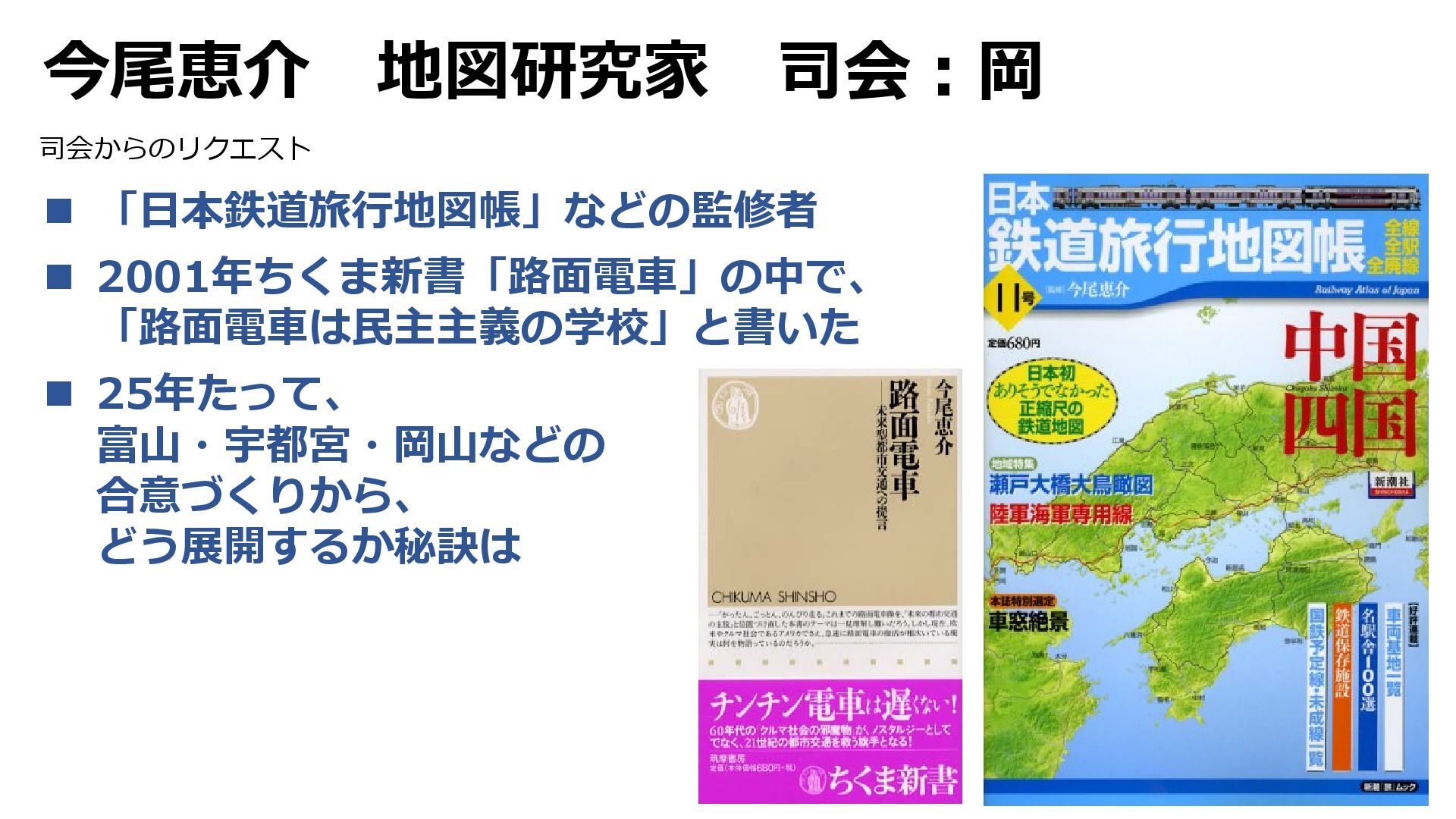 今尾恵介 地図研究家 司会︓岡 「⽇本鉄道旅⾏地図帳」などの監修者 2001年ちくま新書「路⾯電⾞」の中で、 「路⾯電⾞は⺠主主義の学校」と書いた 25年たって、