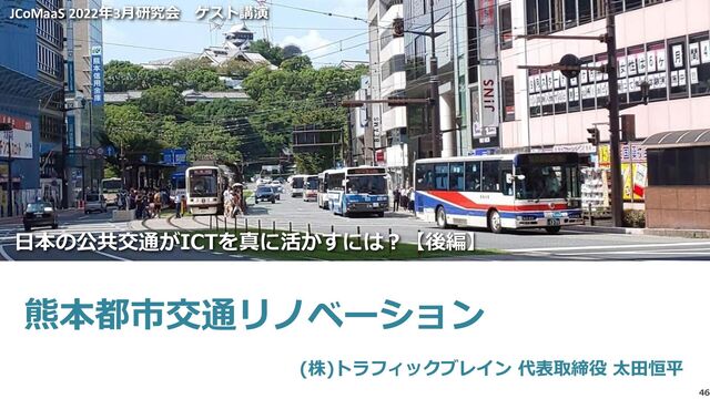 61% 行政の公共交通政策 市電 行政が30億円補助 経常収支 https://jmpo.kumamoto-toshibus.co.jp/opendata/opendata2-1/ 収入 支出 収支 収支率 17億 20億 -2.7億 86% 営業収支 一般会計から3.3億円補助 建設改良費 6.3億 資本的収支 軌条更換、 電停改良等 熊本県 地方バス路線維持費助成 5.2億 調査・計画関係 0.7億 主要事業 計 5.8億 鉄道 南阿蘇鉄道災害復旧 8.2億 並行在来線対策 2.4億 空港 熊本空港直轄事業負担 3.1億 熊本空港国際線振興 2.6億 天草空港運行支援 2.1億 地方公共交通対策≒バス補助 4.9億 交通政策課 計 28.1億 予算 主要事業一覧より 要求・査定の概要より https://www.city.kumamoto.jp/common/Upl oadFileDsp.aspx?c_id=5&id=2422&sub_id= 43&flid=162069 https://www.pref.kumamoto.jp/uploaded/attachme nt/24203.pdf http://www.kotsu- kumamoto.jp/kihon/pub/detail.aspx?c_id=56&id=1123&pg=1 独立採算が原則だが赤字基調 赤字補填がほとんどで投資は乏しい 交通事業者 熊本市 行政の道路政策 主要事業 184億/年 道路整備 プログラム 1600億/10 年 熊本市 道路整備課 217億/年 道路保全課 155億/年 道路整備 プログラム 7000億/10 年 熊本県 https://www.pref.kumamoto.jp/upl oaded/attachment/24208.pdf 要求・査定の概要より 公共交通の2桁上の支出